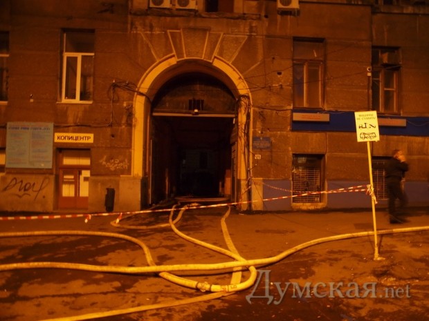 По словам начальника горуправления МЧС Дмитрия Шушулкова, возгорание случилось в служебном помещении электрика физико-химического института им. Богатского, вход в которое находится в подворотне со стороны Троицкой.