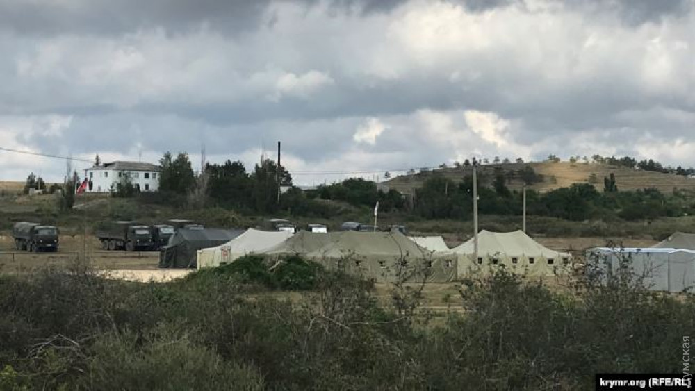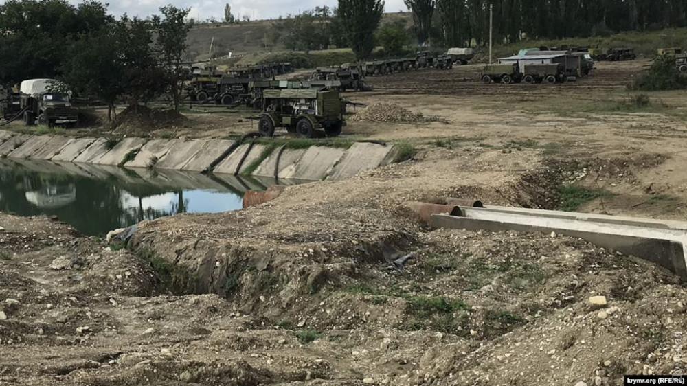 На месте проведения работ военные разбили палаточный городок, задействовано много единиц техники. Специальные автомобили, оснащенные насосами, качают воду в смонтированные трубопроводы. Река Биюк-Карасу ниже земляной дамбы, насыпанной военными, осталась без воды.