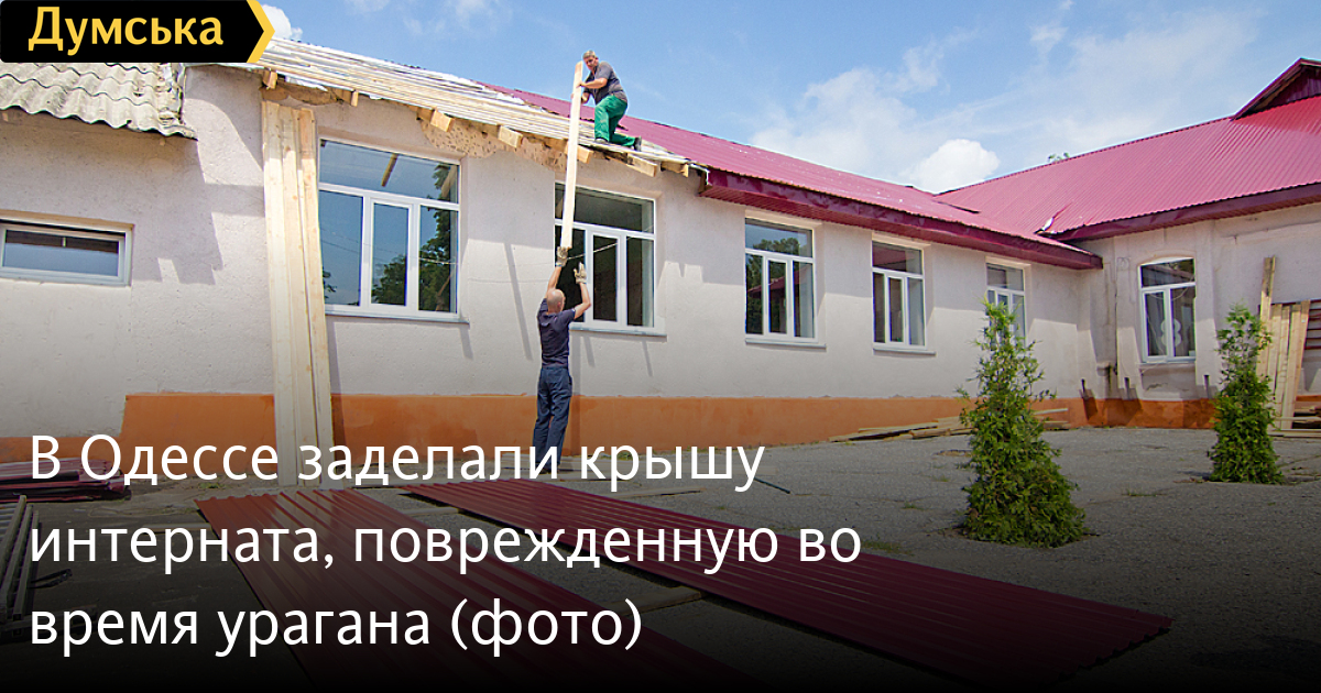 Рабочие завершают ремонт крыши школы-интерната №7 для детей с церебральным параличом и последствиями полиомиелита, поврежденную во время урагана 31 мая.
