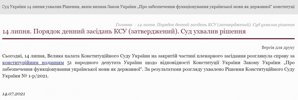 На сайте КСУ отмечается, что на пленарном заседании Большой палаты суда было принято решение о конституционности закона «Об обеспечении функционирования украинского языка как государственного».