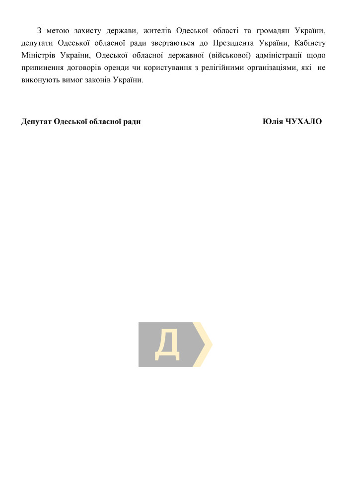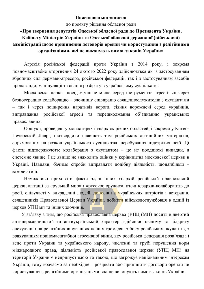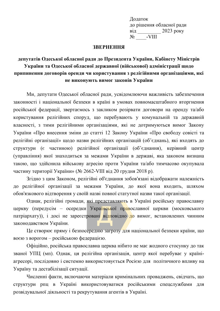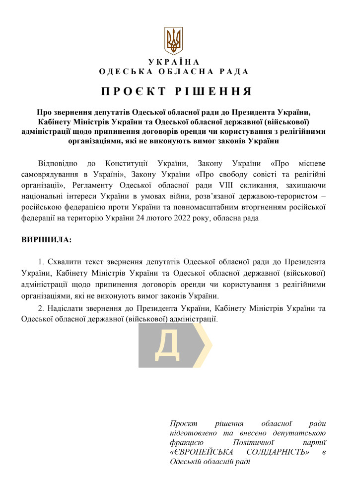 Депутатам предлагали обратиться к Президенту, Верховной раде и областной военной администрации с призывом расторгнуть договоры аренды и/или пользования религиозных сооружений, находящихся в коммунальной и государственной собственности, с теми организациями, которые не указывают в своем названии принадлежность к церкви за пределами Украины.
