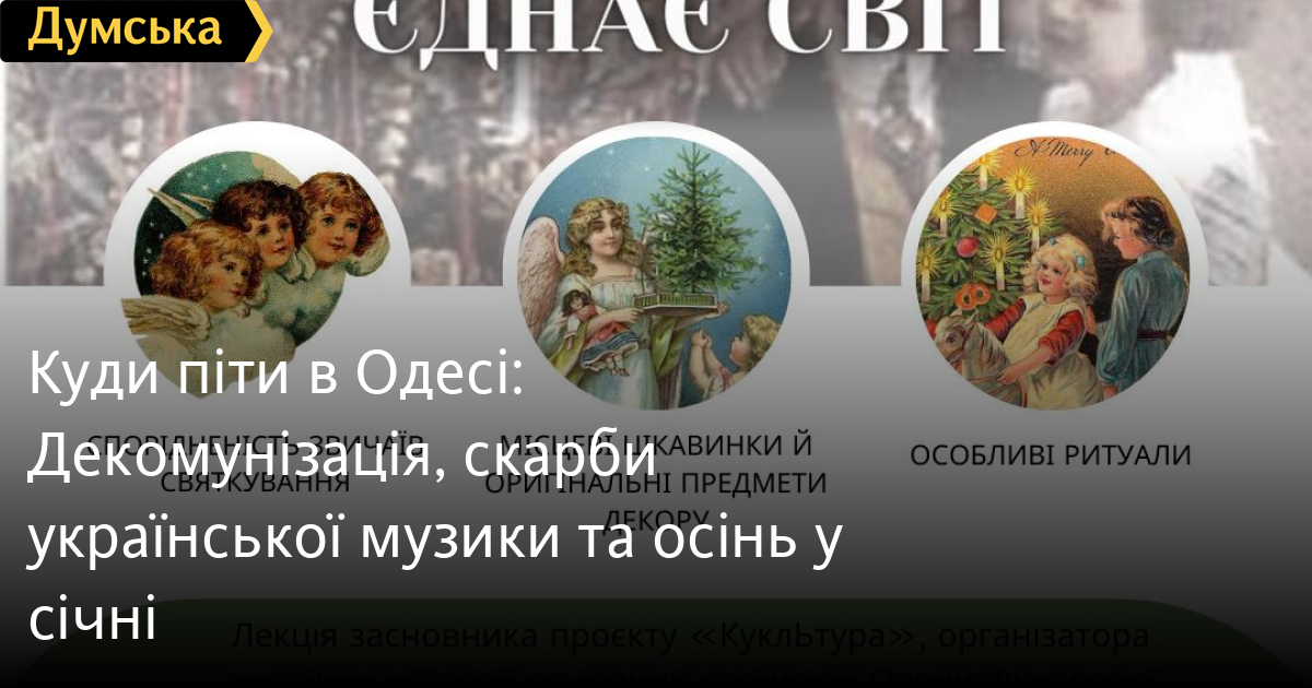 Куди піти в Одесі: «Декомунізація», скарби української музики та осінь у січніСвята продовжуються для шанувальників рубрики «Куди піти в Одесі» від «Думської». Нудитися не доведеться! «ДЕКОМУНІЗАЦІЯ» З ГУМОРОМ Відкриття виставки Дениса Метеліна «Декомунізація» відбудеться 19 січня в Одеському Національному Художньому музеї (Софіївська, 5а). Художник написав серію «Декомунізація» після виїзду з рідного Криму, ностальгуючи про світ свого дитинства. Проте це не романтизація, а констатація штучності радянських ідеалів через крикливі плакатні кольори, які підкреслюють усю нереальність того, що відбувається. Денис з гумором досліджує конфлікт поколінь у суспільстві, який дедалі набирає все більших обертів. Митець шукає місце радянської спадщини в нашому просторі, гіперболізуючи модерністські пейзажі, піднімаючи питання знищення та збереження. Кураторами виставки стали Олег Василенко та Анастасія Явтушенко. Старт о 15:00. Вхід на відкриття вільний, надалі 50-100 гривень. ЗУСТРІЧ ІЗ ПИСЬМЕННИКОМ Творча зустріч з Ігорем Потоцьким «Розмаїття міських вулиць» відбудеться 19 січня у бібліотеці імені Едуарда Багрицького (Преображенська, 35). Під час заходу можна буде особисто поспілкуватися з автором та придбати книгу «Нові невигадані одеські історії». Ігор Йосипович Потоцький закінчив філологічний факультет Одеського державного університету імені Іллі Мечникова. Автор понад 60 книг віршів і прози та численних публікацій у пресі. Ігор Йосипович — лауреат муніципальної премії «Твої імена, Одеса» (2004), Корнійчуківської премії (2014), премії імені Костянтина Паустовського (2019). Понад 20 років керував літературною молодіжною студією «Потік». Вірші Ігоря Потоцького перекладені французькою, фінською, іспанською мовами. Старт о 16:00. Вхід вільний. МУЗИЧНИЙ ПОРТРЕТ УКРАЇНСЬКОГО НАРОДУ Концерт «Українські фрески» відбудеться 19 січня в Міжнародному культурному центрі UNION (Троїцька, 43). Неймовірне та живе виконання професійних музикантів камерного оркестру Black Sea Orchestra познайомить з музикою Вербицького, Степового, Колодуба, Пасічника, Скорика, Леонтовича та інших геніїв української музики. Ці композитори спрямовували свою творчість на підтримку та розвиток української культури та музичної традиції, що робить їхні твори важливим внеском у світову музичну спадщину. Концерт «Українські фрески» демонструє різні напрямки української музики. Ви оціните красу українського романсу, зможете насолодитись подорожжю через скрипковий репертуар, відчуєте динаміку та розвиток української музичної культури від минулого до сучасності. Старт о 19:00. Квитки тут. «РІЗДВО ЄДНАЄ СВІТ» Лекція засновника проєкту «КуклЬтура», організатора виставки «Історії різдвяних іграшок», колекціонера Олени Філіппової про традиції святкування Різдва в Україні та в інших країнах Європи відбудеться 20 січня в локації Одеського Музею західного та східного мистецтва #Ragtime2.0 (Грецька, 16). Ви дізнаєтеся про спорідненість звичаїв у європейських країнах, оригінальні предмети декору до зимових свят, особливі ритуали та багато іншого. В лекції використано безліч матеріалів з численних мандрівок родини Олени Швецією, Німеччиною, Польщею, Нідерландами, Австрією та іншими країнами, де були відвідані етнографічні музеї, фабрики різдвяних іграшок, виробництва скла тощо. Старт о 13:00. Квит