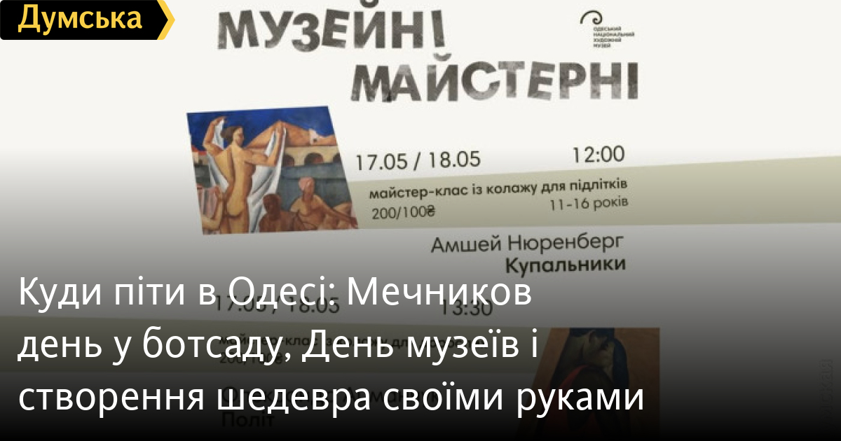 Куди піти в Одесі: Мечников день у ботсаду, День музеїв і створення шедевра своїми рукамиНебанально провести вихідні за порадою рубрики «Куди піти в Одесі» від «Думської» може будь-який читач. Чом би й не ви? «ЧЕРВОНА НИТКА» Поетичні читання зі збірки Віталії Бабущак «Червона нитка» відбудуться 16 травня в бібліотеці імені Паустовського (Градоначальницька, 9). Сповнена поезією душа жінки навіть у найскладніші часи тріпоче між війною та коханням. Старт о 14:00. Вхід вільний. СТВОРИ ШЕДЕВР САМ Майстер-класи з колажування 17 та 18 травня для підлітків та дорослих на честь Дня музеїв влаштовує Національний художній музей у своєму безпечному просторі «Жовті велетні» (Софіївська, 5а). Усіма матеріалами учасників забезпечують. «Ми знаємо, як ви сумуєте за нашою основною колекцією, тож пропонуємо вам доторкнутися до неї через створення колажів за мотивами наших хайлайтів, — обіцяють музейники. — Підліткам (11-16 років) пропонуємо пофантазувати на тему роботи Амшея Нюренберга «Купальники», а дорослим (від 16 років) — на тему роботи Олександра Ацманчука «Політ». На майстер-класах можна буде дізнатися більше про одеських художників ХХ століття; розслабитися за відтворенням їхніх робіт зі старих журналів та кольорового паперу; згадати основну колекцію та поспілкуватися про мистецтво. Старт о 12:00 (11-16 років) та о 13:30 (від 16 років). Вартість – 200-100 гривень. «МУЗЕЙНА ІСТОРІЯ» Curator Talk «Музей у надзвичайні часи. Чим займається ONFAM у доби невизначеності» відбудеться 17 травня в Художньому музеї (Софіївська, 5а). Як музеї стають місцями пам’яті, свідками катастроф та агентами змін, розповість співкуратор виставки «Музейна історія» Валерій Коршунов. У ХХ–ХХІ століттях Худмузей пережив кілька хвиль радикальних змін, спричинених війнами, режимами та ідеологіями. «Музейна історія» зосереджена на періодах, коли глобальні трансформації були особливо відчутними. У цьому проєкті ми рефлексуємо, як досвід минулого відображаються на наших практиках сьогодення. «Ми поговоримо про те, як революція та музейні реформи 1920-х змінили підходи до формування колекції, — каже Коршунов. — Що відбувалося з музеєм під час боїв за Одесу та в роки румунської окупації; як тоталітарна система перетворювала музей на ідеологічний інструмент; які рішення ухвалювала команда музею, щоб зберегти цінності — і що з цього досвіду резонує сьогодні. Це розмова не лише про минуле, а й про сталу роль музею під час повномасштабного вторгнення, коли країна знову перебуває у стані боротьби». Старт о 16:00. Вхід за реєстрацією. ЗАРАДИ ЗЦІЛЕННЯ Благодійний концерт рок-музики пройде 16 травня в More Music Club (Італійська, 75). Частина коштів піде на підтримку арткритикині Уте Кільтер, хворої на синдром Хакіма-Адамса. Старт о 18:30. Вхід – донейшн від 150 гривень. КВІТУЧИЙ БОТСАД Знайомство з Одеським національним університетом імені І.І. Мечникова відбудеться 17 травня у квітучій атмосфері Ботанічного саду університету (Французький бульвар, 48/50). У програмі майстер-класи, фотозони, знайомство з факультетами, коледжами та приймальною комісією. Старт о 11:00. Квитки у касі Ботсаду, школярам вхід вільний. «ЧАРІВНІ МЕЛОДІЇ КОХАННЯ» Концерт студентів другого курсу кафедри оперної підготовки Національної музичної академії імені А. В. Нежданової відбудеться 17 травня у Всесвітньому клубі одеситів (Маразліївська, 7). У про