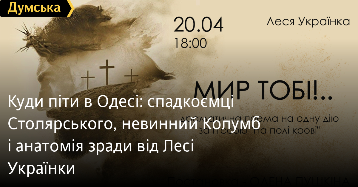 Куди піти в Одесі: спадкоємці Столярського, невинний Колумб і анатомія зради від Лесі УкраїнкиСвято Великодня не відміняє необхідності звірятися з рубрикою «Куди піти в Одесі» від «Думської». Навпаки! «МУЗА ЧАСУ» Виставку живопису Едуарда Пороника «Муза часу» відкриють 18 квітня в Музеї західного та східного мистецтва (Пушкінська, 9). Мистецтво часто стає відображенням часу, в якому створюється. Війна ставить людину на межу. Проте роботи Пороника, попри глибину теми, сповнені світла, філософії та тонкої іронії. У них є смуток, але ще більше — надії та любові. Через пейзажі, природу та людські образи художник передає глибокі переживання, внутрішній світ персонажів і силу життя, що не згасає навіть у найскладніші часи. Кожна картина — це роздуми, що залишають простір для домислювання та особистого прочитання. Тонка майстерність і багатий життєвий досвід митця дозволяють глядачеві знайти власний сенс у кожному полотні. Виставка стає не лише можливістю побачити унікальні роботи, а й знайти в мистецтві віру, натхнення та впевненість у перемозі. Старт о 15:00. Вхід вільний. СПАДКОЄМЦІ СТОЛЯРСЬКОГО Концерт із циклу «Спадкоємці Петра Столярського» відбудеться 18 квітня у Великій залі Одеської філармонії імені Давида Ойстраха (Буніна, 15). Виступатимуть учні музичного ліцею імені професора Столярського Єлизавета Радова, Станіслава Іванова, Борис Білановський, Єва Авдюгіна, Олександра та Григорій Гавриченко. З талановитими дітьми вийде на сцену камерний оркестр Одеської філармонії під орудою Володимира Дикого. Початок о 15:00. Квитки в касі філармонії. ІСТОРІЇ З РЕГІОНІВ Презентація нової книги відбудеться 18 квітня в універсальній науковій бібліотеці імені Михайла Грушевського (Троїцька, 49/51). «І буде місто сповнене життям» – унікальна літературно-художня мозаїка України. 25 історій розкривають душу кожного з 25 регіонів. Це подорож Україною разом з авторкою Єлизаветою Шипіциною та модераторкою Ксенією Сорокіною. Детектив, містика, бувальщини, від яких регочеш до сліз. Світлий сум з присмаком надії, готовність до змін і відданість місцям, де виріс. Кожен автор запрошує на свою малу батьківщину, частуючи її принадами. Це вишукані споруди, вулиці, мости, фортеці, фонтани Головний скарб великої країни – люди з неповторними долями й характерами. Ми осмислюємо минуле й творимо майбутнє. Ми всесильні, бо за нами правда. Ми поборемо тих, хто прийшов у наш дім з хижими намірами. Ця збірка – про міцне коріння, про вміння бачити зорі, розправляти крила й вести за собою. Старт о 15:30. Вхід вільний. FOUR TWENTY Пси-стоунер ніч Four Twenty пройде 19 квітня в More Music Club (Пушкінська, 75). Mist Tower – психоделічно-космічний тріп крізь Всесвіт. Ritual Service – монолітний стоунер дум багаторічної витримки. Suara – повільні зациклені рифи, примітивізм, мінімалізм, монотонність, трансовість. Black Sea Coven – похмурі пророцтва важкого дум-металу, де кожен акорд – це давня істина. Старт о 16:20. Вхід – донейшн від 200 гривень. ТЕРИТОРІЯ ДЖАЗУ Вечір витонченого авторського джазу відбудеться 18 квітня у Міжнародному культурному центрі UNION (Троїцька, 43). Виступатиме Вадим Бессараб — композитор, аранжувальник, керівник оркестру й учасник найвідоміших джазових фестивалів. Вадим представить свою авторську програму у супроводі струнного квінтету та ударних. Це буде музика, що балансує між мрією та емоцією, 