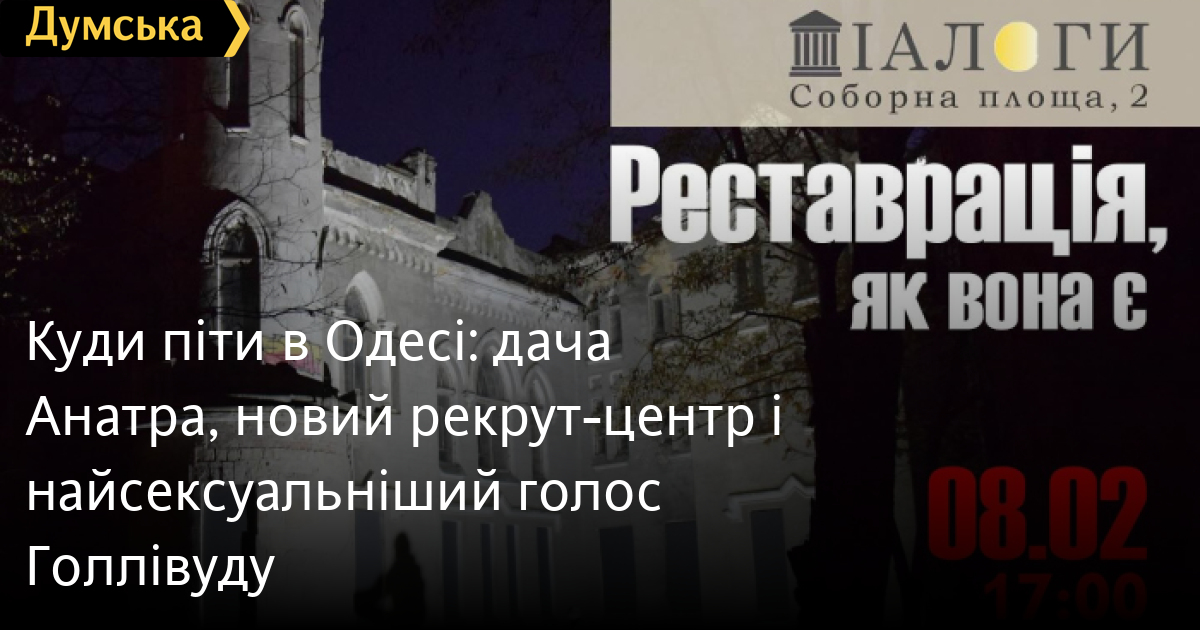 «Ми група ентузіастів, мали відреставрувати знамениту Дачу Анатра в Одесі, що на Французькому бульварі, — зазначає лектор. — Щоб провести реставрацію, потрібно максимально точно дізнатися, яким особняк дачі задумали його власник та архітектор, Володимир Анатра та Юрій Дмитренко. Запрошуємо вас подивитися з нами фільм про цю багатомісячну роботу, про те, як відбувався процес пошуків, хто брав участь у ньому, що вдалося знайти та чим все закінчилося».