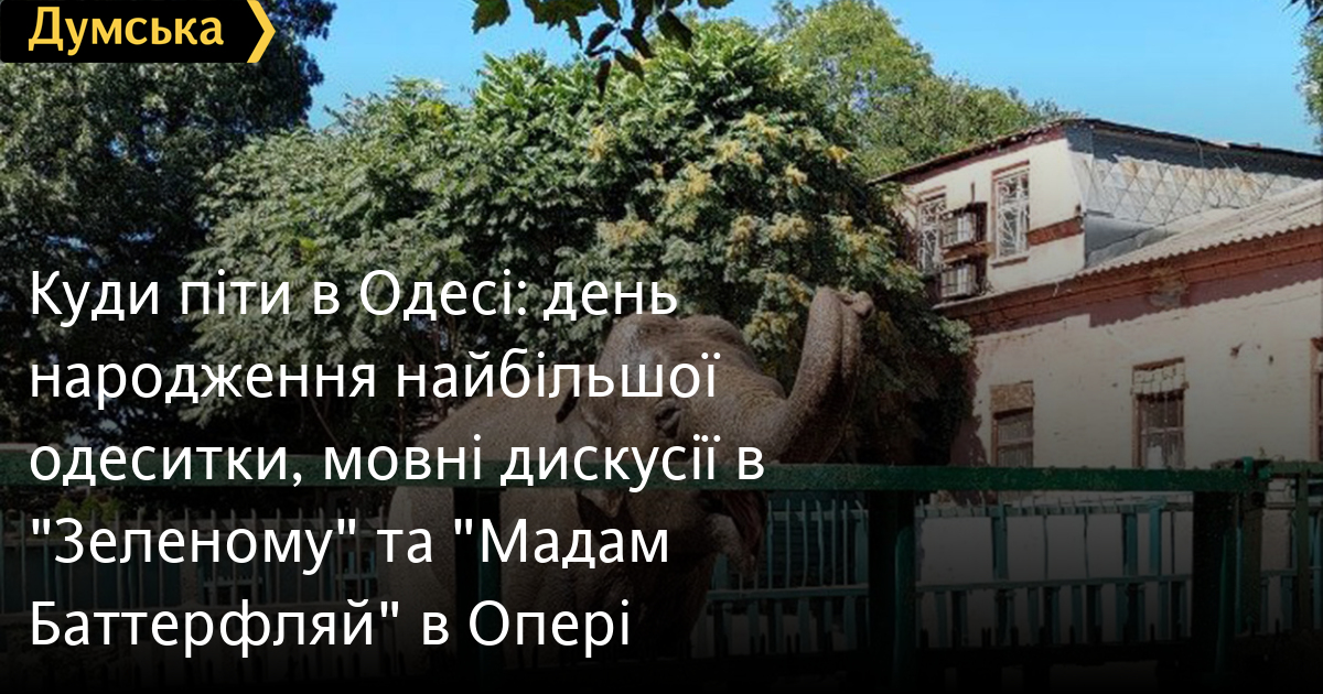 Куди піти в Одесі: день народження найбільшої одеситки, мовні дискусії в «Зеленому» та «Мадам Баттерфляй» в ОперіЗа традицією, у четвер «Думська» знайомить читачів з культурними подіями майбутнього тижня. У рубриці «Куди піти в Одесі» ви знайдете симфонічний концерт у Філармонії, поетичну виставу за творами Ліни Костенко в ТЮГу, лекцію про екзопланети в Планетарії, свято з нагоди дня народження слонихи в зоопарку і багато іншого. «ГАРНО ТАК» Cheev & Соня Морозюк представлять спільний благодійний проєкт «Гарно так» у P1 Prosecco Bar 15 вересня. Співак і художниця вирішили об'єднатися заради допомоги дітям, які постраждали внаслідок російської агресії. Гості зможуть не лише послухати пісні Cheev, а й відвідати благодійну виставку картин художниці Соні Морозюк. «Кожен із вас зможе придбати картину, яка наповнена глибоким змістом і цим же створити власний місток між мистецтвом і допомогою для дітей, які постраждали від війни. У серцях українських дітей завжди живе вогник надії, давайте разом не дамо йому згаснути!» — йдеться в анонсі. Старт о 17:00. Вартість участі — 690 грн. AUTUMN IN NEW YORK Проєкт Autumn in New York представлять 15 вересня у Філармонії. Оркестр під керуванням заслуженого артиста України Ігоря Шаврука виконає твори Айвса, Блоха, Барбера, Гершвіна й Андерсона. Супроводжувати концерт цікавими ремарками буде лектор-музикознавець Ельвіра Паламарчук. Старт о 18:00. Вартість квитків — 100 грн. «КОРСИКАНКА» Комедійну виставу в жанрі історичного анекдоту «Корсиканка» покажуть у Музкомедії 15 вересня. В основу постановки лягла п'єса чеського драматурга Їржі Губача. Дія відбувається на острові Святої Єлени, де на засланні перебуває імператор Наполеон. У нього залишилися тільки спогади про героїчне минуле і мундир, який нині служить городнім опудалом. Але життя імператора кардинально змінюється після того, як у нього вривається неповторна корсиканка Жозефіна. Роль ефектної красуні виконає неперевершена Олеся Жураковська. Старт о 18:00. Вартість квитків — 320-980 грн. ДЕНЬ ВЕНДІ Одеський зоопарк збирається відзначити день народження слонихи. Свято з цієї нагоди відбудеться у звіринці 16 вересня. Винуватиці торжества ось-ось стукне 44 роки. Іменинниця по праву носить звання «найбільшої одеситки». На гостей свята чекає розважальна програма з аніматорами, вікторинами та створення святкового листа для Венді. Старт о 12:00. «КОТЯЧІ СВІТИ ЛУЇСА ВЕЙНА» Захоплюючу лекцію «Котячі світи Луїса Вейна» прочитають 16 вересня в Музеї західного та східного мистецтва. Цього разу йтиметься про життя одного з найвидатніших графіків Вікторіанської епохи Луїса Вейна. Художник, який був до того ж зоозахисником, ілюстратором, а наприкінці життя — пацієнтом психіатричної лікарні, завжди почувався щасливим поруч із котами. У його світі коти танцюють біля різдвяної ялинки, грають у покер і читають книжки. Старт о 14:00. Вартість квитків — 100 грн. (для внутрішньо переміщених осіб вхід вільний). «МАДАМ БАТТЕРФЛЯЙ» Одеська опера запрошує на перегляд вистави «Мадам Баттерфляй» 16 вересня. Показ відбудеться в рамках фестивалю «Оксамитовий сезон». Твір вважається одним із найдраматичніших у світовому оперному репертуарі і розповідає про життя сильної жінки. У центрі сюжету — юна японська гейша Чіо-Чіо-сан. Дівчина носить традиційне кімоно, в якому вона, наче на крилах метелика, летить на бе