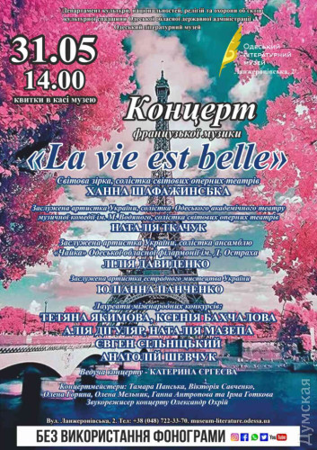 ПРИРОДА НЕ Є ПРИТУЛКОМ Показ відеоарту «Терор у природі» у межах проєкту «За тисячоліття до них, їхньому духові!» відбудеться 30 травня в Музеї сучасного мистецтва Одеси (Європейська, 31/33). Проєкт реалізується за підтримки Британської Ради. Блок розглядає природу як простір, що стає ареною конфлікту, травми та загрози. Художники аналізують, як природне середовище перетинається з насильством — екологічним, соціальним чи історичним. Роботи торкаються теми вразливості та виживання у світі, де природа більше не є безпечним притулком. Анна Потьомкіна разом із Діаною Дерій та Крісом Войтків у відеороботі One day I had sleeping sickness (2024) досліджують сон як простір тривоги. Тіло занурюється в стан між реальністю й кошмаром, де межі безпеки зникають. Девід Шеррі у Performance actions (2021) показує жест і дію як протест. Радикальна тілесність стає інструментом дослідження абсурду та небезпеки сучасного світу. У роботі Даші Чечушкової Sewing. Series about the homeless (2022) через механічні рухи та повторення проглядається втрата дому. Це історії людей, приречених на невидиме існування у суспільному просторі. У Sky. Invasion (2022) Даніїл Ревковський та Андрій Рачинський досліджують війну, що поглинає пейзаж. Небо перетворюється на поле битви, де сприйняття простору назавжди змінюється. Після показів відбудеться обговорення: «Відеоарт, природа та терор: як художники візуалізують екологічні й суспільні загрози» за участі кураторок Анни Мороховської та Юлії Манукян, а також дослідниці Вероніки Магась. Старт о 17:00. Вхід вільний. «ЛЕГКИЙ» ЖАНР Концерт студентів кафедри оперної підготовки Національної музичної академії імені Нежданової відбудеться 31 травня в залі оперної студії (Новосельського, 61). Програма отримала назву «Чарівні мелодії кохання» і складається з уривків зі знаменитих оперет, які будуть представлені в оригінальній і виразній інтерпретації. Протиріччя в цьому немає, адже класична оперета – це маленька опера, і в європейській практиці оперети йдуть на сцені оперних театрів. Обізнаність молодих виконавців у «легкому» жанрі підвищує їхню професійну цінність. Тому й наполегливо працювали зі студентами над цією програмою режисер Ірина Красіліна, концертмейстер Євгенія Бейник, диригент Степан Макієнко, а ведуча концерту Анна Березіна цікаво розповість глядачам про кожний номер концерту. Старт о 14:00. Вхід вільний. LA VIE EST BELLE Концерт французької музики La vie est belle відбудеться 31 травня в Літературному музеї (Ланжеронівська, 2). Відомі співаки виконають арії з опер Меєрбера, Гуно, Деліба, Бізе, Массне, номери з мюзиклів та популярний французький шансон. Старт о 14:00. Квитки в касі музею. СЮРРЕАЛІСТ ТА ЙОГО МУЗА Лекцію про найяскравішого сюрреаліста Макса Ернста прочитає 31 травня Анастасія Фролкова в Музеї західного та східного мистецтва (Пушкінська, 9). Макс Ернст – один з перших, хто зумів знайти аналог автоматичного письма у живописі, допомагав Бретону тлумачити Фрейда і дуже плідно займався містикою, зокрема алхімією. Кожна його жінка – це частина одного цілого, цілого Всесвіту, де чоловік єднається з жінкою, як коханець і як андрогін. Але найбільше уваги ми приділимо його останній дружині – Доротеї Таннінг, яскравій художниці. Старт о 14:00. Вартість квитків 100 гривень.