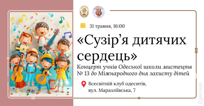ЮНІ АРТИСТИ Святковий концерт учнів Одеської школи мистецтв №13 «Сузір’я дитячих сердець», присвячений Міжнародному дню захисту дітей, відбудеться 31 травня у Всесвітньому клубі одеситів (Маразліївська, 7). Це не просто виступи — це яскраве завершення навчального року, коли кожен юний артист продемонструє свої досягнення, творче зростання і любов до музики. У програмі концерту — яскраві номери, сольне та ансамблеве виконання. На сцену вийдуть лауреати конкурсів, активні учасники концертного життя міста, ті, чиї виступи й талант уже сьогодні творять майбутнє українського мистецтва. Старт о 16:00. Вхід за благодійним внеском. КАРТИНА — КРАЩИЙ ПОДАРУНОК Лекцію з циклу «Історії одеського мистецтва» прочитає Сергій Седих 31 травня у творчому просторі «Діалоги» (Соборна площа, 2). Дарувати чи не дарувати? Це питання постає перед багатьма митцями в усі часи. Картина — це не просто предмет інтер’єру, це енергія, емоція, послання. І коли художник дарує свій твір, він віддає частинку себе. Але чи завжди це доречно? І що стоїть за подібними жестами — альтруїзм, надія на взаємність, стратегія чи життєва драма? На лекції «Подарунок. Частина друга: дари художника» ми поговоримо про одну незвичайну історію, що сталася в Одесі у середині XIX століття. Картина, яка стала подарунком, — і те, що стояло за цим дарунком, змінить ваше уявлення про одеське мистецтво тієї доби. Старт о 17:00. Організаційний внесок 150 гривень. «ПЛАНЕТА ЩАСЛИВИХ ДІТЕЙ» Відсвяткувати Міжнародний день захисту дітей на яскравому дитячому фестивалі «Планета щасливих дітей» можна 31 травня та 1 червня в Літньому театрі та біля ротонди Міського саду. На вас чекає справжнє свято дитинства з безліччю розваг. Міський фестиваль таланту, краси та моделей для дітей та підлітків «Міні Міс, Містер та TeenOdesa 2025» — 1 червня з 14:00 до 16:00. Також у програмі весела пінна вечірка, улюблені всіма ростові ляльки, стрибки на батуті та надувні гірки, активні та веселі аніматори, ярмарок хендмейду, різноманітні майстер-класи тощо. Усе це – під виступи яскравих творчих колективів мистецьких шкіл Одеси. Старт о 12:00. Вхід вільний. STICKS AND STONE Гурт Youthex 31 травня презентує збірку Sticks and Stones в More Music Club (Італійська, 75). Youthex – справжній глем, нестримна енергія і мелодійні рифи, яскраве шоу на сцені. Спеціальні гості: Freakadelix — це безсмертні пісні праотців важкого звуку, британців Black Sabbath у виконанні досвідчених одеських музикантів; Squat Apart – метал панк дійство з легендарних одеських Черемушек. Старт о 19:00. Вхід – донейшн від 200 гривень. ФЕСТ У ПАРКУ Благодійний MoreFestДІТИ пройде 1 червня у парку Марка Твена. Це не просто свято — це частина грандіозного всеукраїнського фестивалю «РАЗОМ», який відбудеться одночасно на 26-ти локаціях у різних містах України. Планується участь понад 10 тисяч дітей — і кожен з них отримає турботу, увагу та радість! MoreFestДІТИ— це велика розважальна програма, це більше 20-ти локацій з активностями, це подарунки та сюрпризи від майже півсотні партнерів. Старт о 12:00. Вхід вільний. Лекція в межах циклу «Всесвітня історія кіно» 1 червня відбудеться в Музеї західного та східного мистецтва (Італійська, 9). П'єр Паоло Пазоліні – найбільша постать в італійській культурі ХХ століття. Кінорежисер, автор кількох десятків стрічок, кожна з яких зараз сприймається як класична – «Мама Рома», «Цар Едіп», «Декамерон», «Єва
