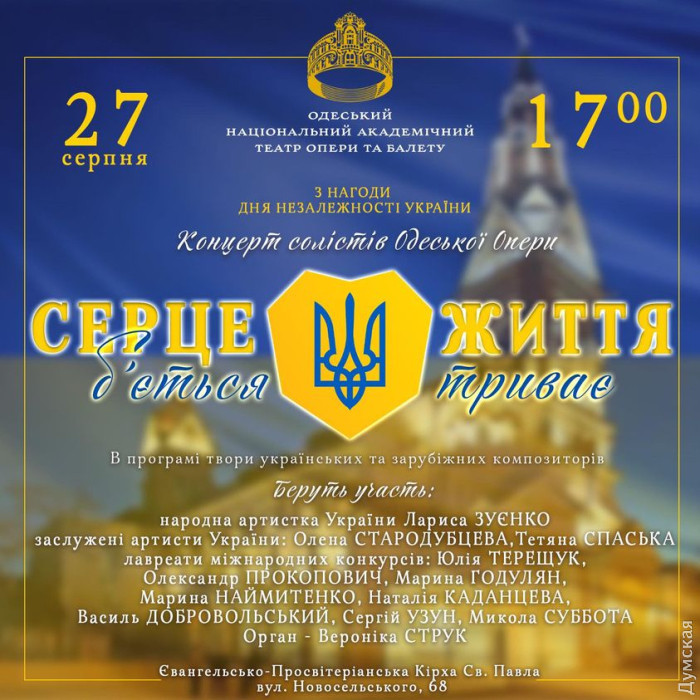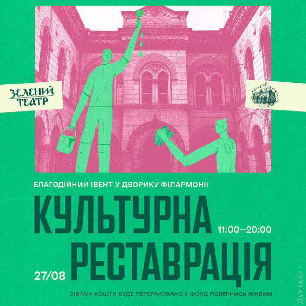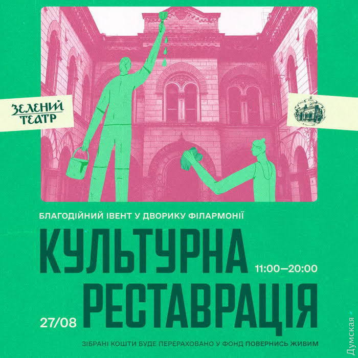 Куди піти в Одесі: виставка «Слава України», «Культурна реставрація» у Філармонії та архпрогулянкиЛіто підходить до свого завершення, але попереду нас чекає тепла одеська осінь. Тож продовжуємо жити, вірити в наших захисників та читати рубрику «Куди піти в Одесі«. «Думська» нагадує — не ігноруйте сигнали повітряної тривоги. «СЛАВА УКРАЇНИ!» У Музеї західного та східного мистецтва відкрилася виставка з промовистою назвою «Слава України!», приурочена до Дня Незалежності. Також тут презентовано проекти «У/Враження» та «НовоНароджені». Автори висловили у своїх роботах повагу до минулого своєї країни, думки про тяжке та героїчне сьогодення та надію на світле майбутнє вільної України. До експозиції «Слава України» увійшла колекція оригінальних проектів «Barbie: пані Україна» та «Barbie: мрійники та винахідники», створені до 30-річчя Незалежності. У проекті «Ураження/Враження» представлені об'єкти-рефлексії на тему війни та миру, створені одеськими авторами. А у благодійному проекті «НовоНароджені» від проекту «КуклЬтура» експоновано близько 70 робіт у вигляді ляльок, фотографій та живопису, які створюють своєрідний літопис війни. Експозиція буде відкрита для відвідувачів до 4 вересня. Виставка працює щодня, крім середи, з 12:00 до 18:00. Вартість квитків – 50 грн. «СЛОНИКИ» Маленьких глядачів 27 серпня чекають у Ляльковому театрі на виставу «Слоники». За словами організаторів, це захоплююча пригода в африканських джунглях, повна екзотичних тварин та запальних танців. Старт об 11:00. Вартість квитків – 150 грн. Для сімей вимушено переміщених осіб та дітей з особливостями розвитку – відвідування театру є безкоштовним. «КУЛЬТУРНА РЕСТАВРАЦІЯ» Зелений театр 27 серпня запрошує одеситів та гостей міста до дворика Філармонії – тут відбудеться захід під назвою «Культурна реставрація». У його рамках заплановано графічно-поетичну виставку ілюстраторів, маркет художників-дизайнерів та їх автентичних виробів, книжковий маркет від «Видавництва Старого Лева». Також буде традиційний фуд-корт з українською кухнею та особливий музичний супровід. Усі зібрані кошти організатори передадуть до фонду «Повернися живим». Захід пройде з 11:00 до 20:00. Старт об 11:00. Вхід – fee donation. СВЯТО В ЗООПАРКУ В Одеському зоопарку 27 серпня відбудеться свято, присвячене Дню Незалежності України. Для гостей буде організовано святкову програму за участю веселих аніматорів та виступом дитячого хореографічного колективу «Казка». Також заплановано майстер-клас із створення найбільшої листівки до Дня Незалежності. Для тих, хто прийшов в українській вишиванці, вхід вільний. Старт об 11:00. Вартість квитків уточнюйте. На сцені Одеської музкомедії 27 та 28 серпня оживе знаменитий твір Миколи Гоголя «Ніч перед Різдвом» під музику Ігоря Поклада. Глядачі опиняться всередині різдвяної розповіді про казкову історію кохання коваля Вакули та красуні Оксани, пронизаного духом фольклору, народних переказів та легенд. «Передріздвяна атмосфера мюзиклу виплескується зі сцени в зал для глядачів і неможливо не поринути в цей чарівний світ української зимової ночі», — йдеться в анонсі. Старт о 16:00. Вартість квитків – 100-300 грн. «СЕРЦЕ Б'ЄТЬСЯ: ЖИТТЯ ТРИВАЄ!» На честь Дня Незалежності України 27 серпня в одеській Кірсі відбудеться концерт української музики «Серце б'ється: життя триває». Концерт прой