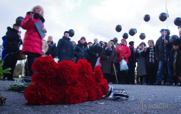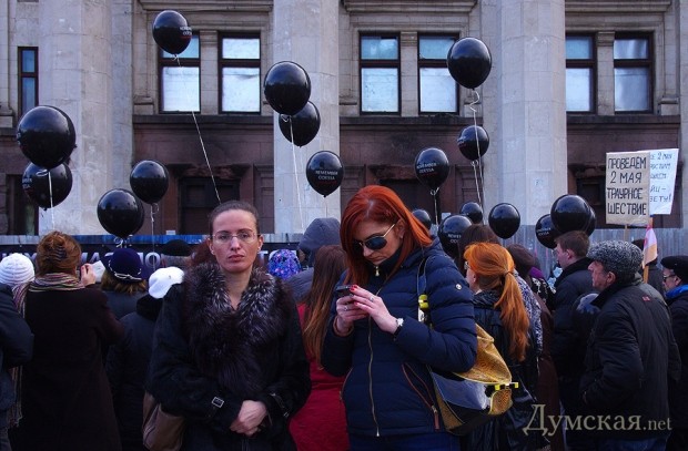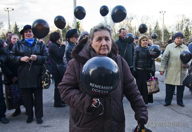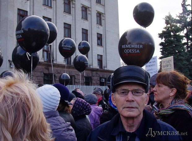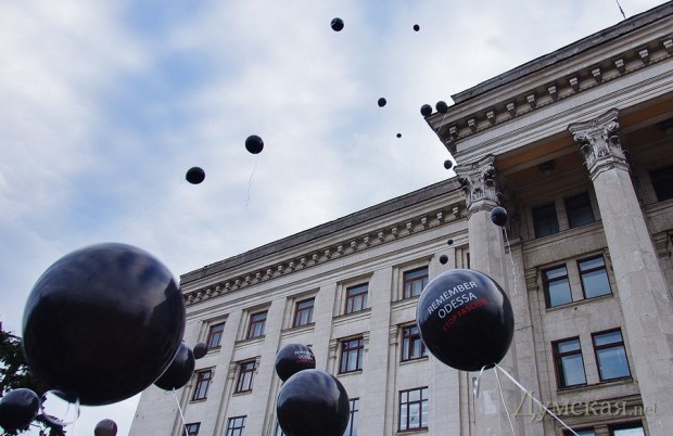 Сегодня на Куликовом поле пророссийски настроенные горожане провели традиционную акцию в память о погибших 2 мая. Вот уже  десять месяцев подряд, каждое второе число, они запускают в небо воздушные шары черного цвета, после чего обсуждают события в стране.