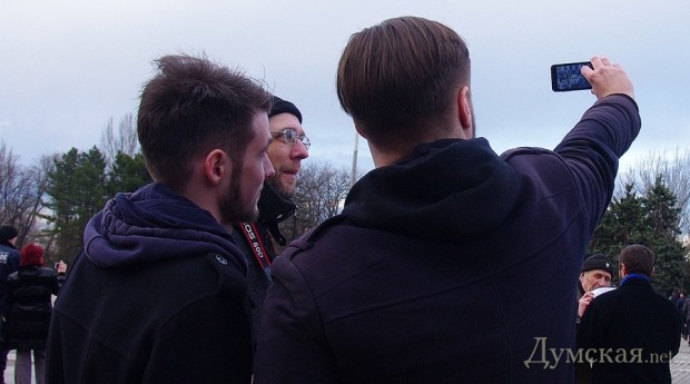 Сегодняшнее мероприятие было бы ничем не примечательно, не появись у проукраинских одесситов желания помешать оппонентам. Около сотни человек, две трети из которых являются футбольными фанатами, решили составить компанию любителям России и тоже пришли на площадь.