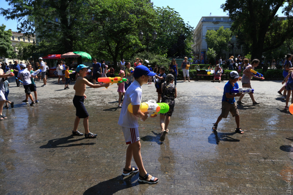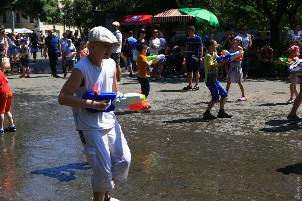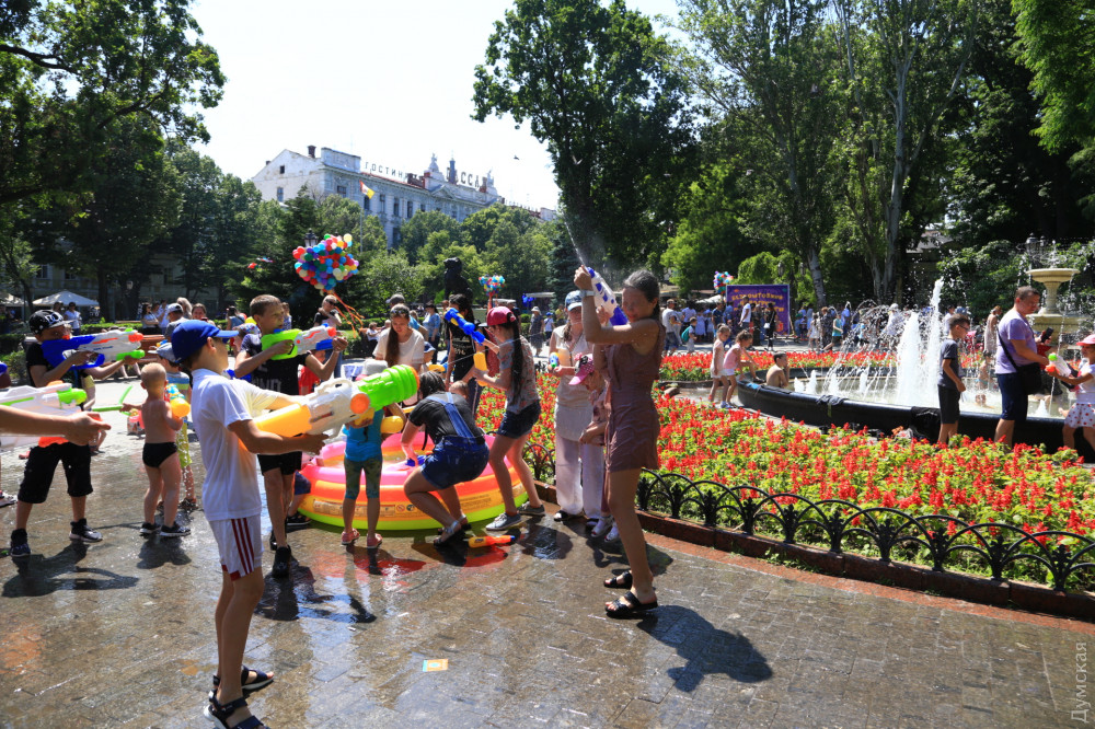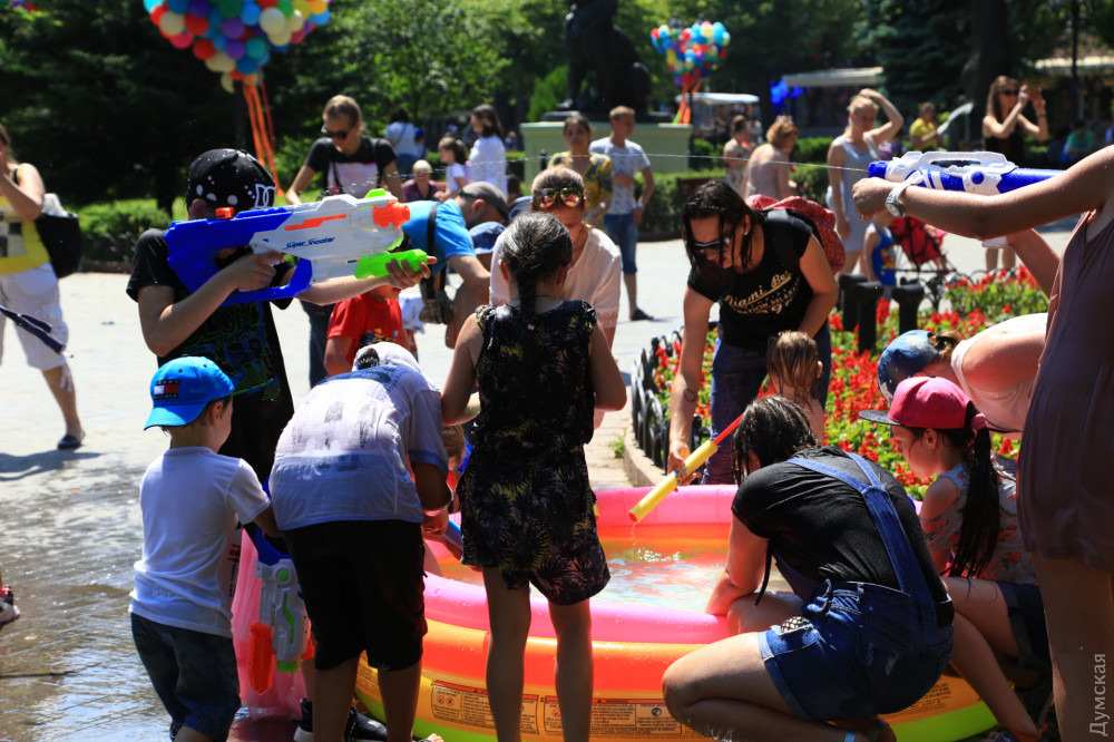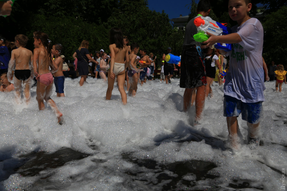 А прямо сейчас возле фонтана проходит водная и пенная битвы. Несколько десятков детей, вооруженных водными пистолетами и ружьями, стреляют друг в друга.