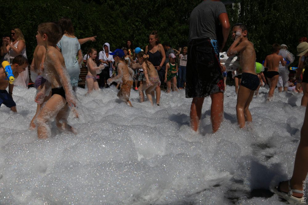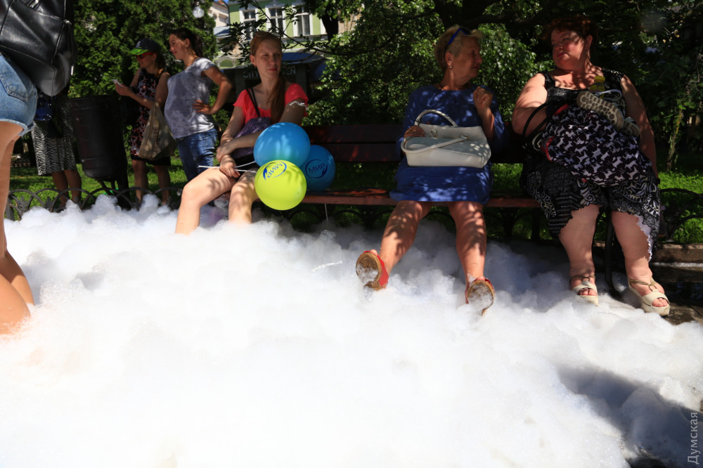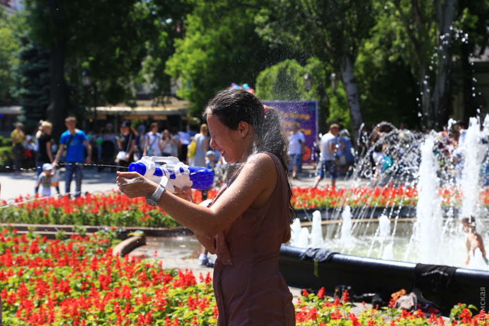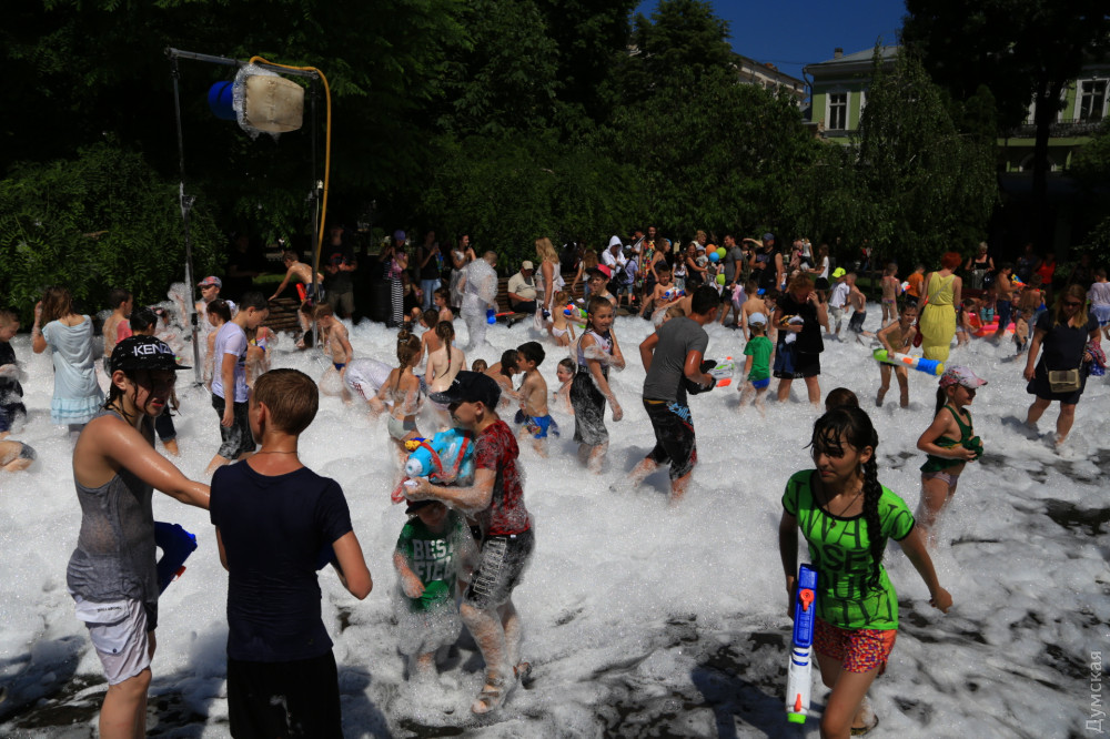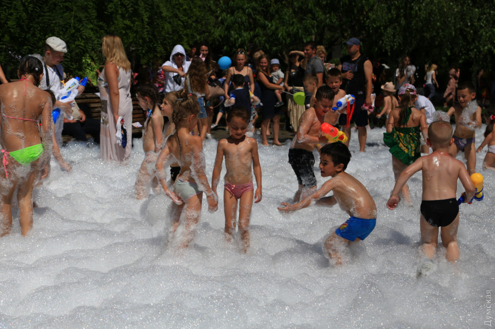 А прямо сейчас возле фонтана проходит водная и пенная битвы. Несколько десятков детей, вооруженных водными пистолетами и ружьями, стреляют друг в друга.