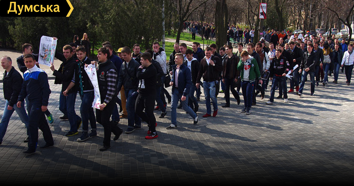 Война войной, а Юморина – по расписанию. Во всяком случае, для курсантов Одесского морского колледжа технического флота, которые прошлись сегодня костюмированным парадом по аллеям парка Шевченко. «Зомби», «гастарбайтеры», «фанаты» и «медсестры» — каждая группа представляла свою заранее выбранную тематику, связанную со специализацией или высмеивающую обычные студенческие пороки – разгильдяйство, беспечность и т.п. «Первое апреля в нашем колледже – день непослушания. Этой традиции не меньше десяти лет: один раз в году курсанты могут прийти на построение, одетыми не по форме. Когда-то мы умещались на плацу нашего колледжа, но сейчас у нас более тысячи кадетов и курсантов, так что приходится выходить за пределы учебного заведения», — рассказал начальник Одесского морского колледжа технического флота Одесской национальной морской академии Анатолий Опарин.