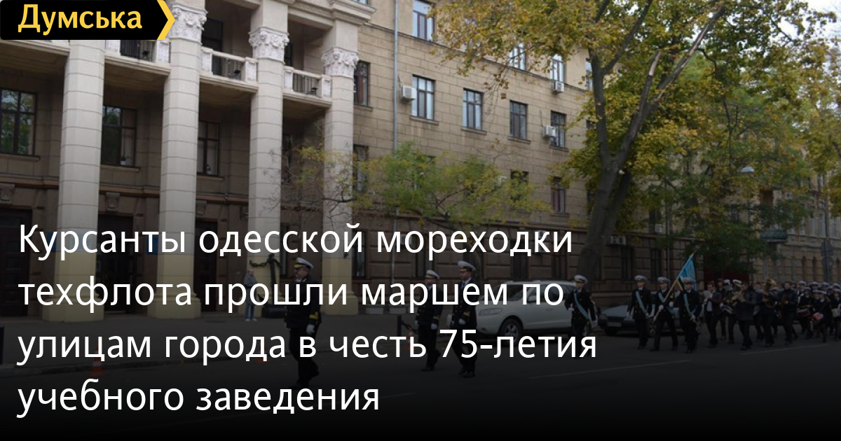 Курсанты одесской мореходки техфлота прошли маршем по улицам города в честь 75-летия учебного заведенияОдесскому морскому колледжу техфлота сегодня исполнилось 75 лет. В честь праздника курсанты и преподаватели учебного заведения прошли маршем по центру города. У здания Английского клуба (музея морфлота) состоялся торжественный митинг и награждение отличившихся учащихся и сотрудников. Мореходный колледж технического флота Одесской национальной морской академии является единственным в Украине морским учебным учреждением, которое осуществляет подготовку командных кадров плавсостава среднего звена для дноуглубительного флота: судоводителей-багермейстеров и судовых механиков, обслуживающих и эксплуатирующих специализированные дноуглубительные снаряды, составляющие основу технического флота. Учебное заведение было основано в 1944 году под названием «Одесский морской строительный техникум» с целью подготовки техников-судоводителей-багермейстеров, техников-механиков и гидротехников. Здание техникума построено на месте взорванного в 1941 году комплекса областного управления НКВД. Фото МКТФ СМЕРТЬ РОССИЙСКИМ ОККУПАНТАМ! Заметили ошибку? Выделяйте слова с ошибкой и нажимайте control-enter |