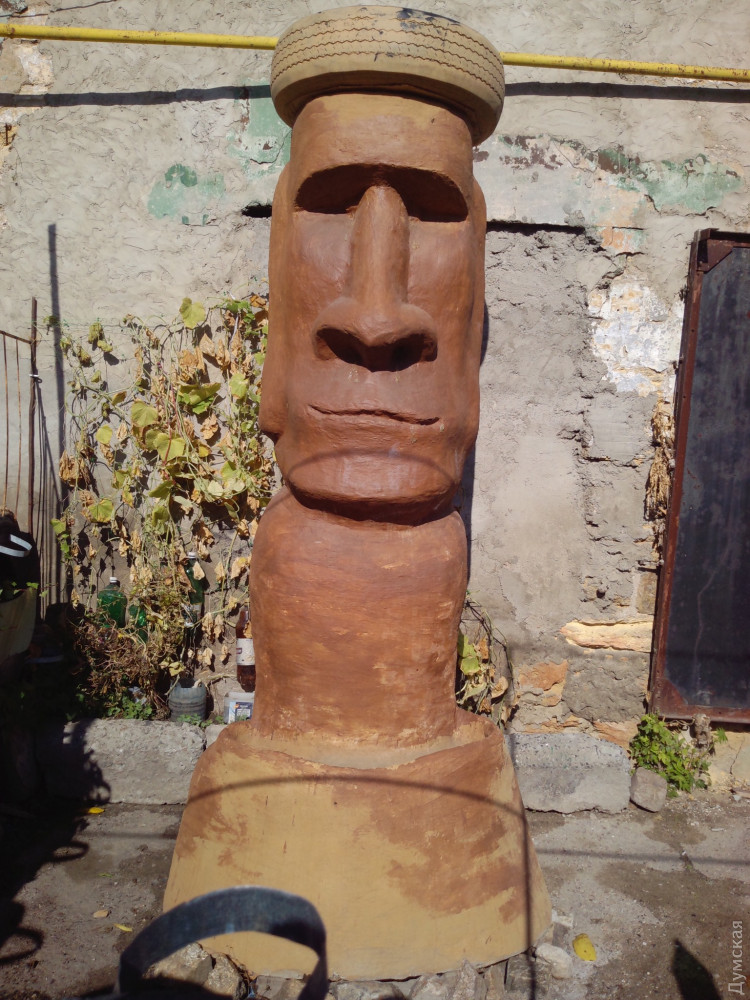 Как и у некоторых полинезийских собратьев, у одесского моаи имеется головной убор. Правда, в его роли выступает автомобильная покрышка.