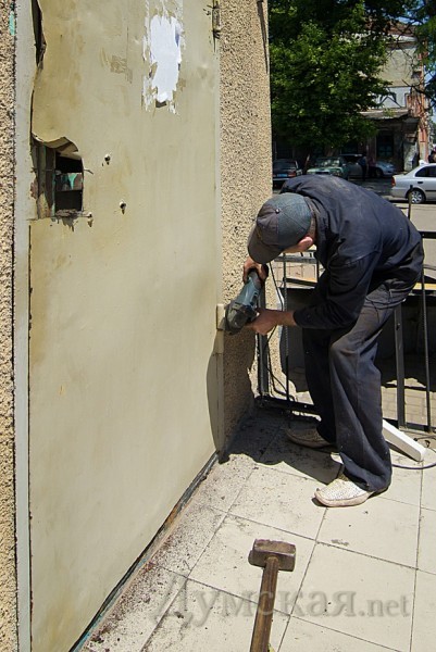 Городские власти в лице представителя департамента по управлению коммунальной собственностью Вадима Серых не нашли ничего лучше, чем спилить петли и вырвать входную дверь на участок. В дело пошла «болгарка» и главное оружие одесской власти – кувалда.