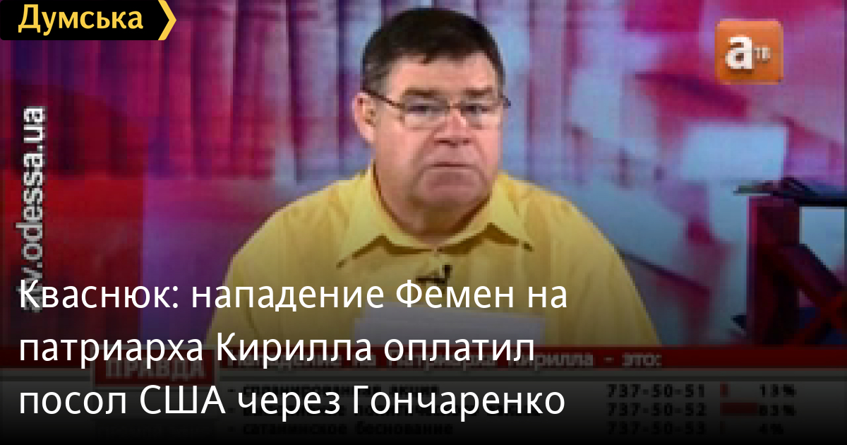 Скандально известный депутат Одесского горсовета от партии «Родина» Григорий Кваснюк в своей авторской передаче на телеканале АТВ высказал довольно неординардное предположение об истинном организаторе нападения активистки Femen на Патриарха Кирилла.