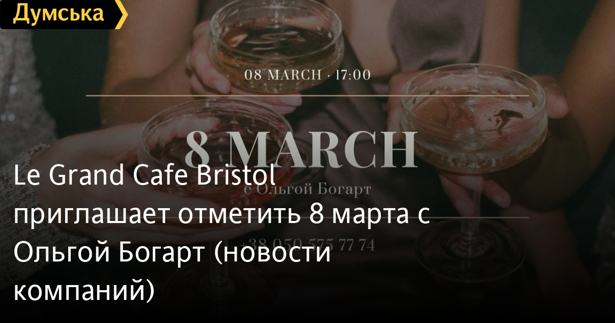 Le Grand Cafe Bristol приглашает отметить 8 марта с Ольгой Богарт (новости компаний)8 марта ресторан Le Grand Cafe Bristol приглашает на праздничный ужин в честь международного женского дня. Всех женщин этим вечером ждут сюрпризы. «Для начала мы поздравим всех женщин изящным комплиментом от шефа — легчайшим желе из шампанского! Специальное праздничное меню, разработанное только для этого праздника, выглядит любопытным и по-весеннему легким!» — рассказали в Le Grand Cafe Bristol. А в 19:00 гостей ждет главный подарок — выступление вокалистки группы «Дети Фиделя», участницы шоу «Голос країни» — Ольги Богатыренко. «Живая музыка и игристое будут литься рекой в этот вечер, мы обещаем!» — приглашают организаторы. В ресторане действует депозит в размере 1000 гривен на одного гостя. Количество мест ограничено, поэтому бронировать столики лучше заранее по телефону: 050 575 77 74. СМЕРТЬ РОССИЙСКИМ ОККУПАНТАМ! Заметили ошибку? Выделяйте слова с ошибкой и нажимайте control-enter |