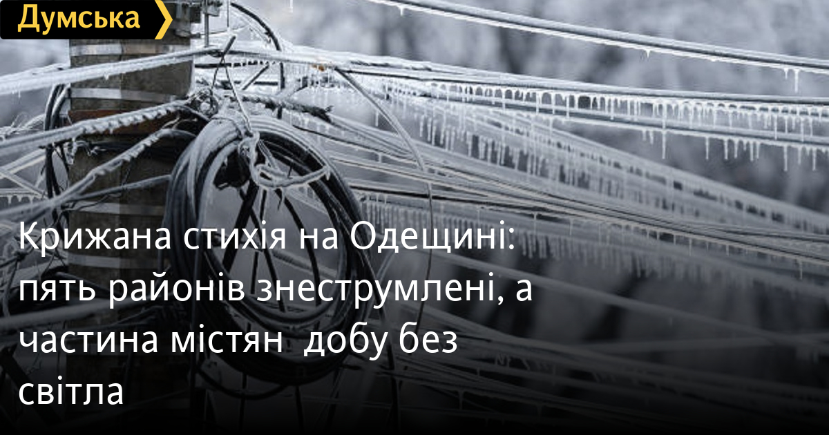 Крижана стихія на Одещині: п’ять районів знеструмлені, а частина містян — добу без світлаМешканці Подільського, Березівського, Роздільнянського, Білгород-Дністровського та Одеського районів області через складні погодні умови залишилися без світла. Як повідомили в ДТЕК, різке намерзання льоду на дротах стало причиною численних обривів ліній та поломок обладнання. Станом на ранок 31 січня деякі мешканці Одеси перебувають без електроенергії вже понад добу. Наразі енергетики пріоритетно забезпечують живлення об’єктів критичної інфраструктури. «Наші фахівці працювали всю ніч і продовжують обстежувати лінії та ремонтувати обладнання зараз. Робимо все можливе, щоб якомога швидше повернути світло в оселі», — зазначають у компанії. Кореспонденти «Думської» повідомляють, з 9:00 ранку в деяких районах Одеси почалося поступове відновлення електропостачання. СМЕРТЬ РОСІЙСЬКИМ ОКУПАНТАМ! Помітили помилку? Виділяйте слова з помилкою та натискайте control-enter |