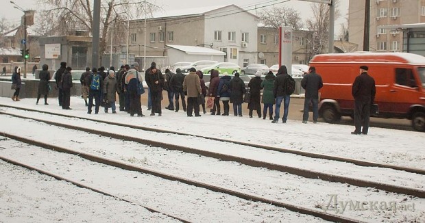 Последствия вчерашнего каприза природы в виде снегопада с дождем, как и следовало ожидать, обернулись для Одессы транспортным коллапсом. Из общественного транспорта ходят только маршрутки, но и те не могут вместить всех желающих не опоздать на работу.