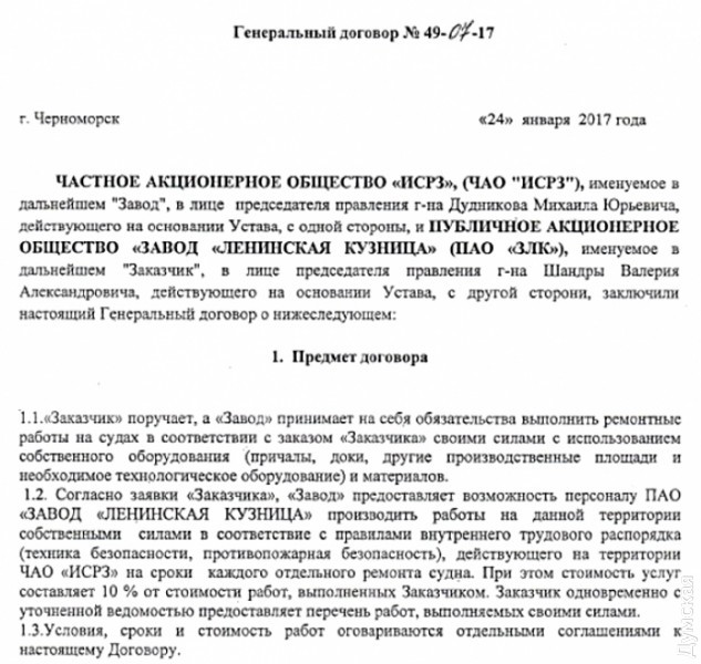 Об этом идет речь в договоре, заключенном между ПАО «Завод «Ленинская кузница» и ЧАО «ИСРЗ» (Ильичевский судоремонтный завод). Он предусматривает возможность проведения ремонта кораблей и судов на территории последнего за 10% от тендерной стоимости работ. Работы будут производится персоналом «Кузницы».