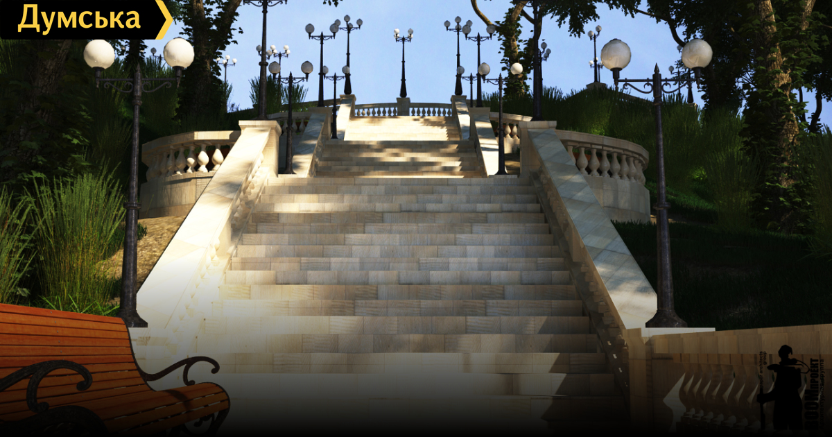 «Думской» стало известно, какой именно может стать лестница, ведущая с Гагаринского плато в Аркадию, после реконструкции. Пока существует только визуализация, проект — в разработке.