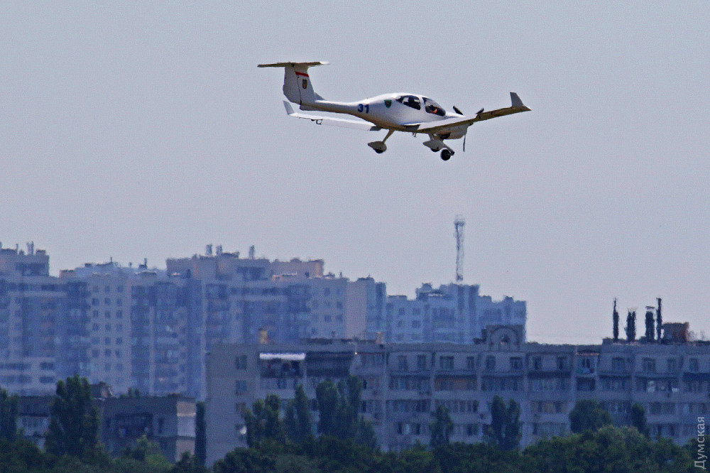 Во время церемонии пилоты одесского пограничного отряда подняли в небо два легкомоторных самолета Diamond DA40, чтобы пройти над заводом и отдать коллегам последние почести.