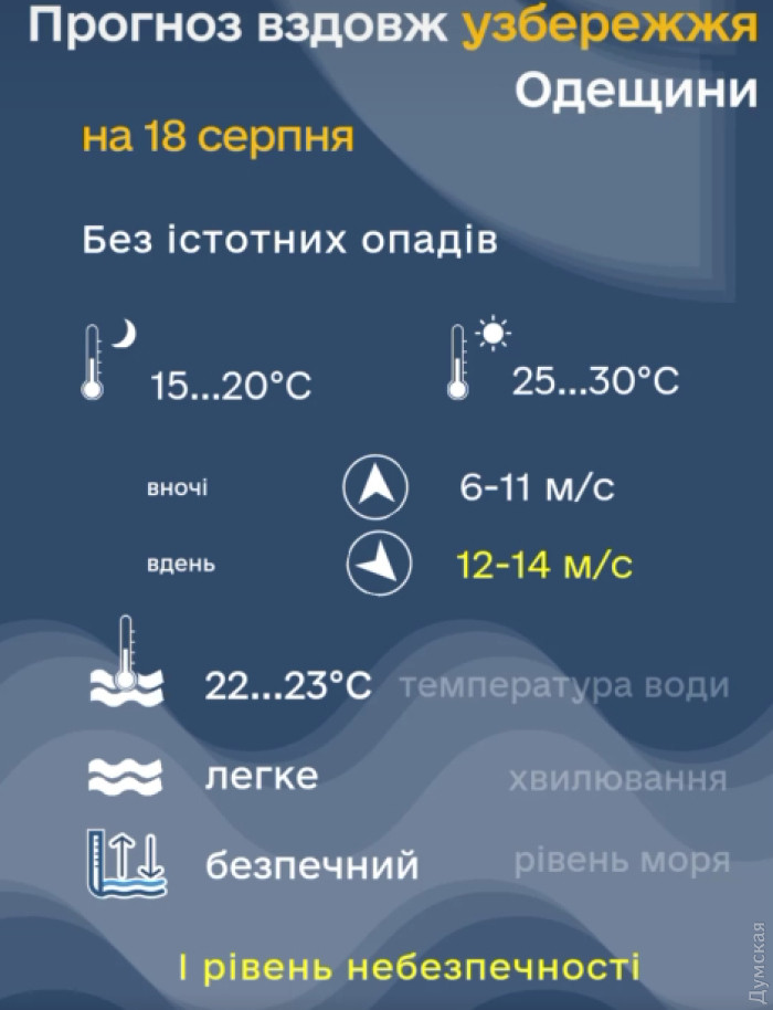 Лето не сдает позиции: в Одесской области — штормовое предупреждение, грозы и пожарная опасностьШтормовое предупреждение из-за сильного ветра объявили в Одесской области на понедельник, 18 августа. Об опасных метеорологических явлениях I уровня (желтого) опасности сообщают в Гидрометцентре Черного и Азовского морей. Синоптики прогнозируют местами кратковременный дождь и грозу утром и днем в области. Ветер северо-западный 9-14 м/с. Вдоль побережья – 12-14 м/с. Температура ночью +14+19°С, днем +25+30°С. В Одессе без существенных осадков, столбики термометров ночью опустятся до +17+19°С, днем температура поднимется до +26+28°С. Морская вода около +22°С. Кроме того, в некоторых районах области 18 августа ожидается чрезвычайный уровень пожарной опасности. СМЕРТЬ РОССИЙСКИМ ОККУПАНТАМ! Заметили ошибку? Выделяйте слова с ошибкой и нажимайте control-enter |