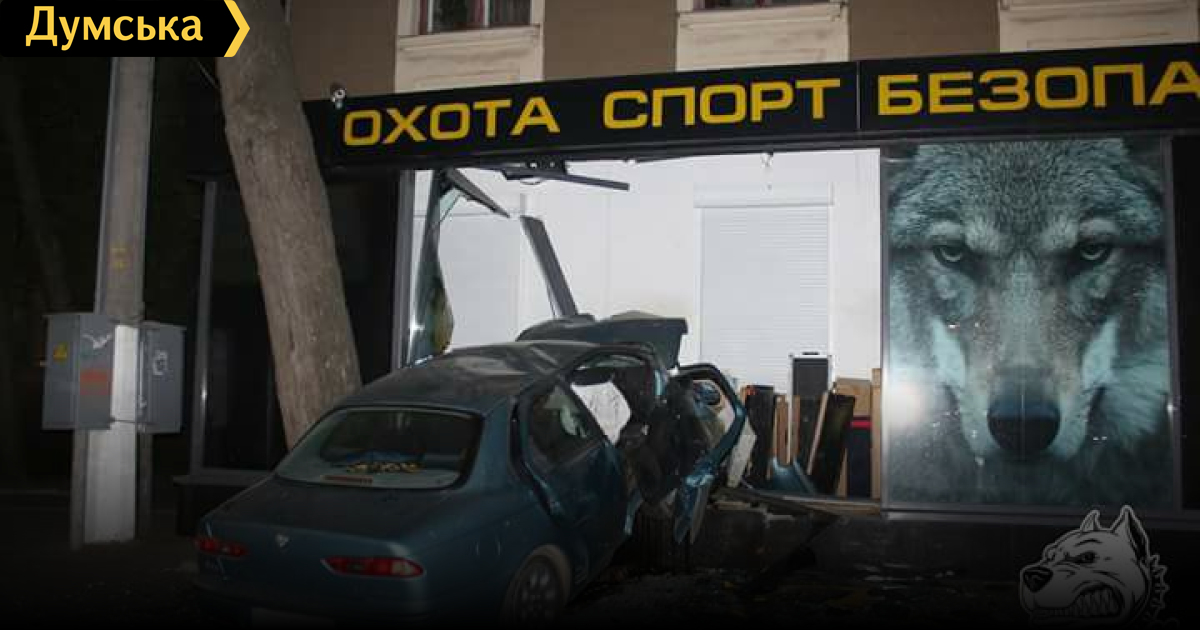 Автомобиль Аlfa Romeo с польской регистрацией влетел в витрину оружейного магазина Stvol, расположенного на первом этаже здания Александровского полицейского участка (дом с каланчой) на перекрестке Ришельевской и Пантелеймоновской.