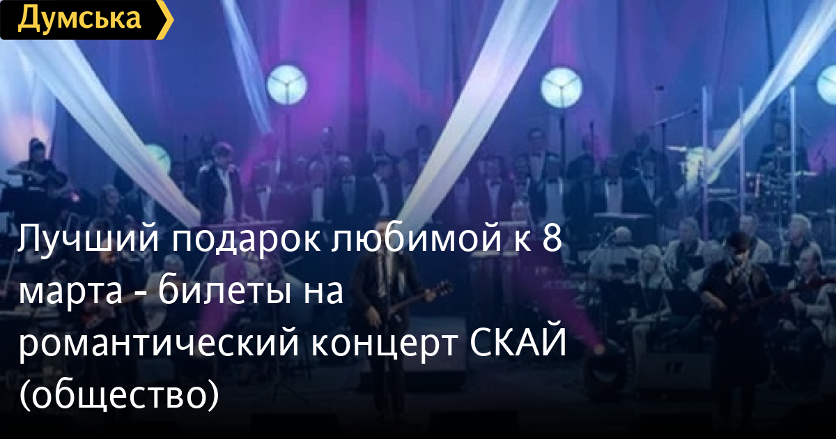 Найкращий подарунок коханій до 8 березня — квитки на романтичний концерт СКАЙ (суспільство)«Легковажна», «Струна», «Крила», «Вертаюсь з перемогою», «Напролом» і ще два десятки хітів — все це у новій концертній програмі СКАЙ. Давно відомі пісні та нові хіти, які Ви почуєте першими 1 травня в Одеському академічному театрі музичної комедії ім. М. Водяного! Концерти, які будуть зіграні на струнах наших душ. Концерти, де ми будемо разом співати й танцювати; сміятись і плакати від щастя; освідчуватись у коханні та втрачати голову від почуттів. Концерти, які залишать слід у наших серцях. Не пропусти! Квитки від 195 грн. СМЕРТЬ РОСІЙСЬКИМ ОКУПАНТАМ! Помітили помилку? Виділяйте слова з помилкою та натискайте control-enter |