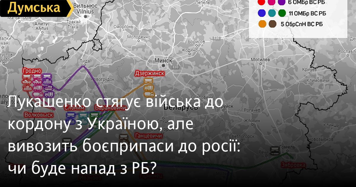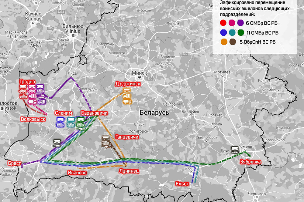 За даними деяких телеграм-каналів північного сусіда (РБ), протягом тижня залізничні потяги доставили до Єльська, Бреста, Волковиська, Зябрівки та Іваново танки Т-72Б/Б3, бойові машини піхоти БМП-1/2, транспортери МТ-ЛБ, а також 122-мм самохідні артилерійські установки 2С1 «Гвоздика».