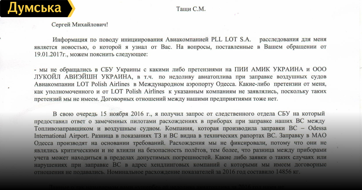 Работающая в одесском аэропорту фирма «Лукойл Авиейшен Украина», которую СБУ заподозрила в недоливе топлива самолетам польской авиакомпании LOT, отрицает свою вину. Об этом говорится в заявлении ПИИ «АМИК Украина», чьим дочерним предприятием является «Лукойл Авиейшен». «Руководство ПИИ «АМИК УКРАИНА» а также руководство материнской компании — AMIC Energy Management GMBH крайне обеспокоено происходящим, так как указанные действия со стороны представителей силовых структур не имеют под собой никаких объективных оснований, — отмечает начальник юридического управления «АМИК» Сергей Тащи. — Информация о нанесении какого либо ущерба польской авиакомпании LOT также полностью опровергнута самой авиакомпанией». В компании добавили, что 18 января СБУ провела обыски в международном аэропорту «Одесса». При этом были изъяты документы и оргтехника «Лукойла», что затруднило его работу. «АМИК» приложило к своему заявлению копию письма представителя компании «ЛОТ». Согласно документу, поляки не подавали каких-либо заявлений о причинении им ущерба со стороны ООО «Лукойл Авиейшен Украина». Недолив топлива, который, действительно, составил примерно 14 тонн, находился в пределах нормативных отклонений. Напомним, согласно материалам уголовного производства, которое расследует СБУ, в прошлом году «Лукойл» недолил польским самолетам 14 тысяч килограммов приобретенного топлива. СМЕРТЬ РОСІЙСЬКИМ ОКУПАНТАМ! Помітили помилку? Виділяйте слова з помилкою та натискайте control-enter Новини по цій темі: 18 квітня 2024: Ексмер Одеси Олексій Костусєв ховається від слідства в елітному районі Лондона: стала відома його адреса 29 березня 2024: Справа про заволодіння аеропортом "Одеса": ексвіцемер Орловський відбувся умовним терміном 28 лютого 2024: Відкрити українське небо: чим Бориспіль відрізняється від Бен-Гуріона і що потрібно зробити для відновлення авіасполучення? 23 лютого 2024: Костусєв ховається у Лондоні: за крадіжку одеського аеропорту його судитимуть заочно 11 грудня 2023: Ексмера Одеси Костусєва заочно постановили ув`язнити в СІЗО |