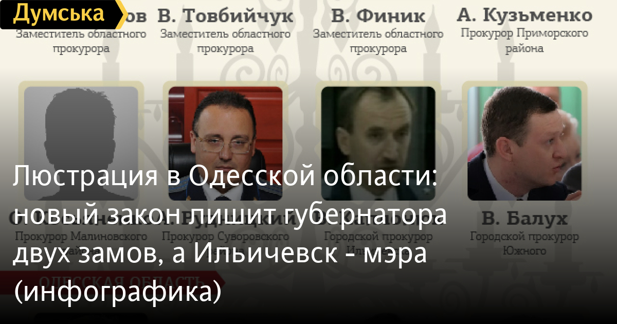 Еще люстрация коснется городских прокуроров Ильичевска и Южного Валерия Каплонюка и Вадима Балуха. Кроме того, вскоре могут снять прокуроров Одесской, Черноморской и Ильичевской прокуратур по надзору за соблюдением законности в транспортной сфере — Илью Юрко, Ростислава Крикливого и Александра Нимого.