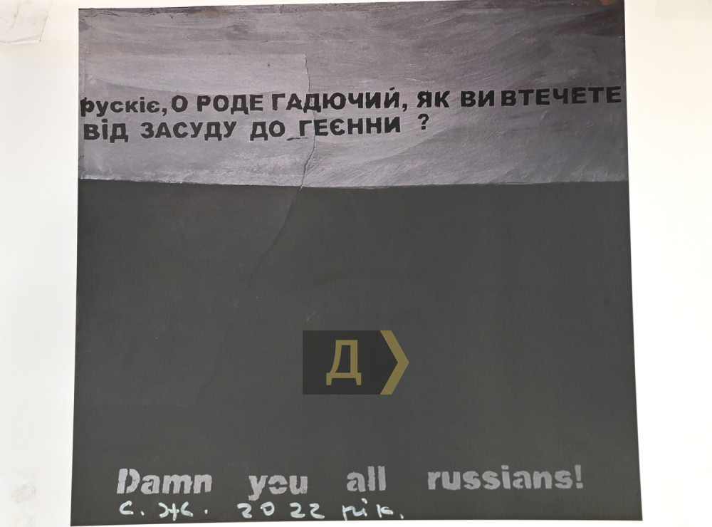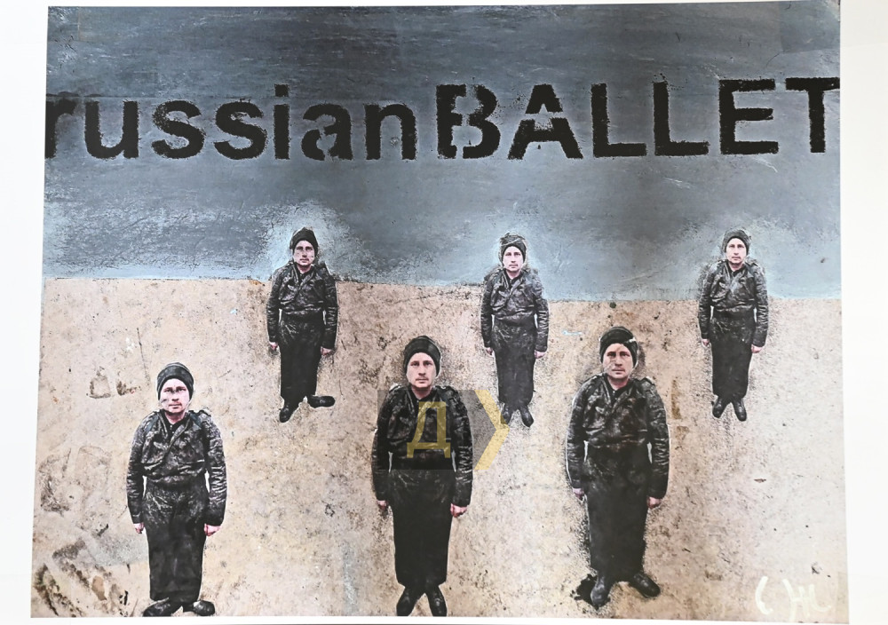 Свою любовь к коллажированию автор на этот раз подчеркнул текстами, написанными при помощи трафаретов – сухое, механистичное исполнение, но смысл обжигает разум. А зритель вместе с художником надеется, что скоро придет конец лютующих военных месяцев.