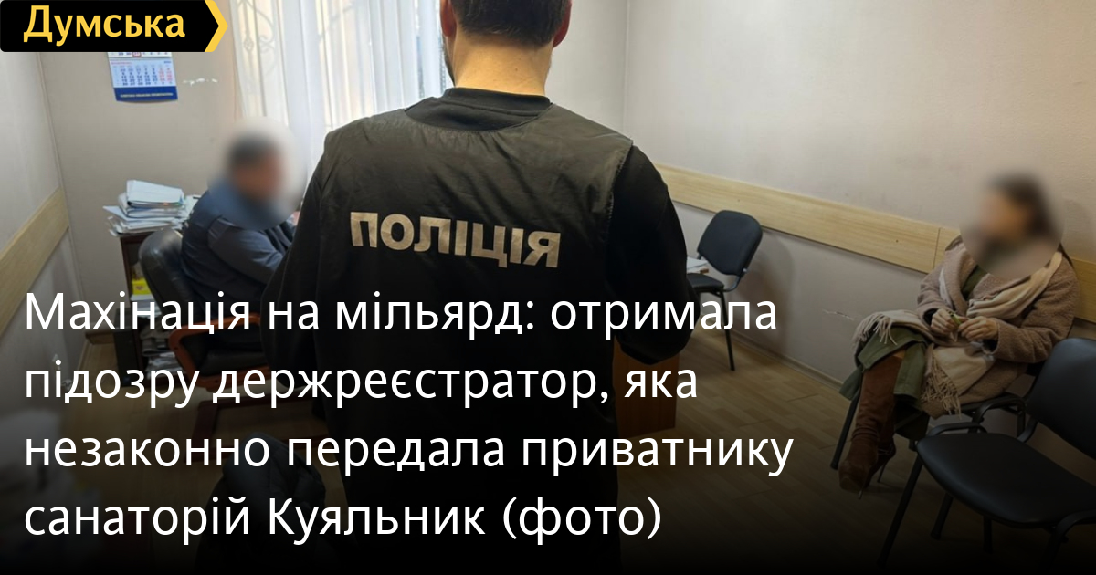 Махінація на мільярд: отримала підозру держреєстратор, яка незаконно передала приватнику санаторій «Куяльник»Правоохоронці повідомили підозру державному реєстратору, яка незаконно провернула відчуження з держвласності одеського санаторію «Куяльник». У департаменті стратегічних розслідувань Нацполіції повідомили, що фігурантка незаконно змінила дані про власника санаторію. Її дії завдали державі збитків на майже мільярд гривень. Нагадаємо, 2023 року «Куяльник» через суд повернули до держвласності. До цього він був у руках приватного акціонерного товариства «Укрпрофоздоровниця», яке також володіло іншими санаторіями, зокрема одеськими здравницями «Лермонтовським» та «Зеленим Мисом». Їх також повернули державі — зараз це лікувально-реабілітаційні центри Міністерства оборони та Нацгвардії відповідно. Помітили помилку? Виділяйте слова з помилкою та натискайте control-enter |