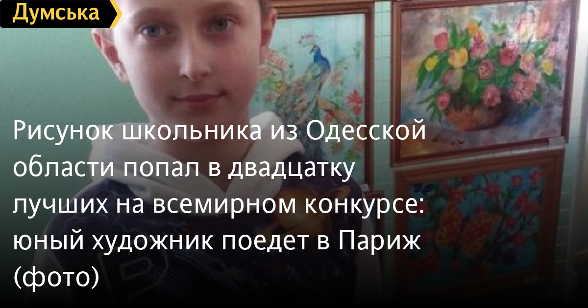 Рисунок юного измаильчанина, воспитанника тамошнего Дворца детей и юношества Артема Малоока стал единственной украинской работой, вошедшей в финальную двадцатку международного художественного конкурса «Нарисуй мне Мир» (категория 8-12 лет).