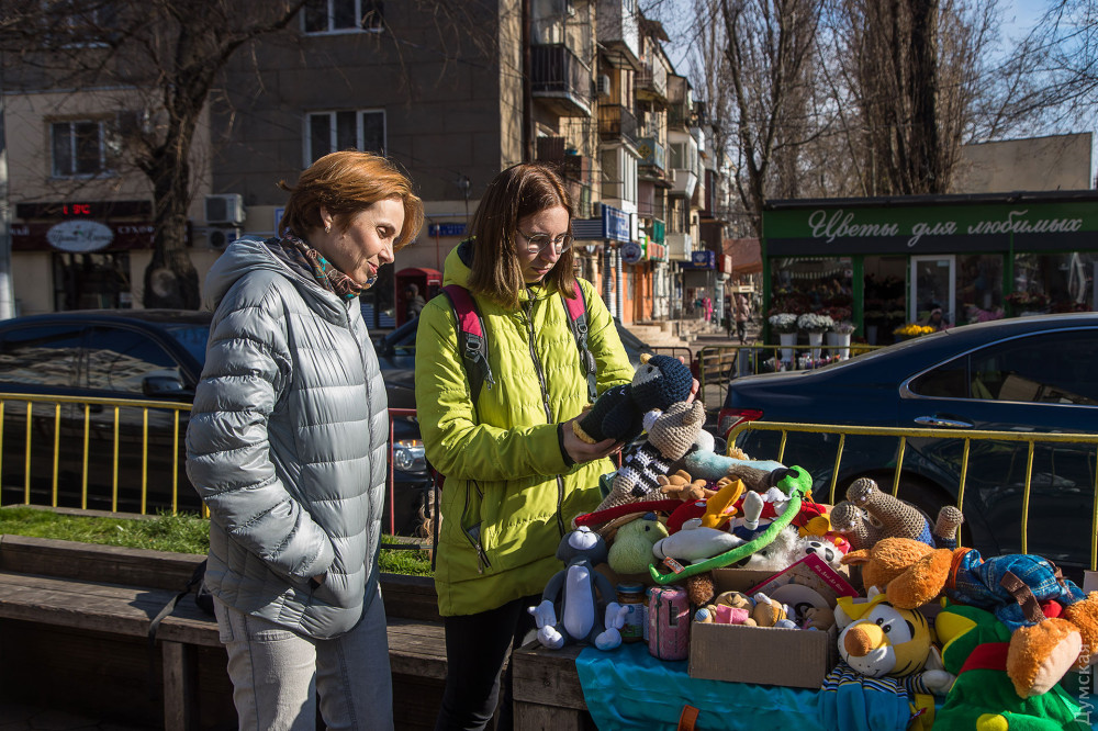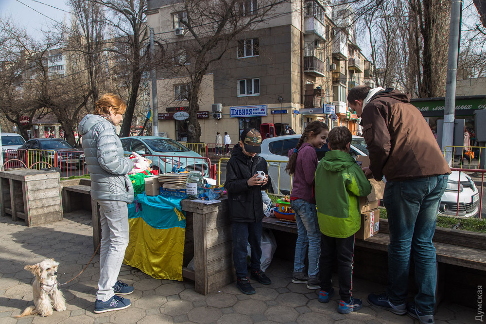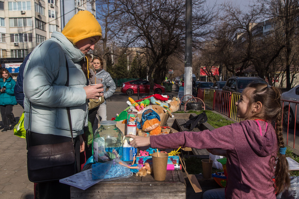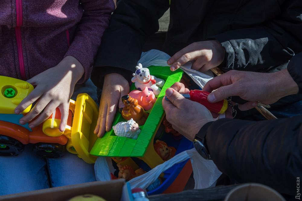 По словам Карины, когда закончились игрушки с «седьмого», дети вынесли свои, а потом ненужные игрушки стали приносить горожане. Пока корреспонденты «Думской» общались с юными предпринимателями, к столику подошли три одессита с пакетами игрушек и передали их детям.