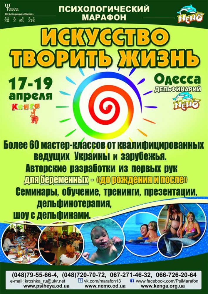 В Одессе пройдет психологический марафон «Искусство творить жизнь» (на правах рекламы)С 17 по 19 апреля в Одессе будет проходить Марафон психологических, оздоровительных и образовательных программ «Искусство творить жизнь». Как сообщают организаторы, в программе марафона — уникальные методики и эффективные тренинги признанных мастеров психологии. «Идея создания Марафона психологических практик возникла у инициативной группы Ассоциации «Психея» в результате многолетнего сотрудничества в рамках проведения медико-психологических форумов «Жизнь до рождения и после», многие из которых проходили в дельфинарии «Немо» с первых дней его основания», — говорится в сообщении. Миссия марафона – интеграция современных психологических практик в социальную культуру, презентация инновационных направлений психотерапии, творческая актуализация личности. Проект рассчитан на всех, кто ощущает потребность в саморазвитии, познании, построении гармоничных межличностных отношений, творческой самореализации. Для будущих родителей, ответственно готовящихся к появлению малыша, родителей с детьми, которым близки идеи гармоничного развития малышей, саморазвития, творчества и здорового образа жизнь. И, конечно, для специалистов: психологов, педагогов, медиков. «Программа форума — очень насыщенна и разнообразна. Она включает несколько тематических площадок, где каждый сможет найти себе занятие по душе. И что немаловажно, встретиться снова или познакомиться с единомышленниками», — подчеркивают организаторы. Так, на марафоне будут представлены следующие направления: СМЕРТЬ РОСІЙСЬКИМ ОКУПАНТАМ! Помітили помилку? Виділяйте слова з помилкою та натискайте control-enter |