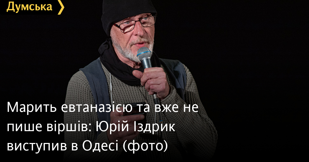 Марить евтаназією та вже не пише віршів: Юрій Іздрик виступив в ОдесіТворчий вечір одного з найвідоміших українських поетів Юрія Іздрика пройшов у Великій залі Одеської філармонії дуже жваво й весело. Успішним виявився збір коштів на потреби 93-ї бригади (лотами на аукціоні були колекційні монети, збірки віршів Іздрика та платівка із записом творів Леся Подерв’янського у виконанні автора). Автограф-сесія викликала неабиякий ажіотаж, пан Юрій тільки просив називати свої імена голосніше («Дідо глухуватий»). За власним зізнанням, віршів він вже не пише сім років, поетичне сприйняття світу зникло. Але поет залишається поетом, навіть коли не створює нового. Отже, Юрій Іздрик розповідає (ми зберегли всі особливості авторського стилю й вимови) про те, що його бентежить нині. У поета п’ять життів Статистика каже, шо в кожній популяції якихось відхилень, так званих девіацій чи то психічних на кшталт шизофренії, чи гендерних на кшталт гомосексуалізму, приблизно дев’ять відсотків. Закон великих чисел. І приблизно стільки ж людей у західноєвропейській, скажімо, англосаксонській цивілізації ходять слухати поезію. Це не стосується України. Якийсь дивовижний бум навколо цього, люди їздять на всілякі літературні фестивалі, в столиці тривога, а люди стоять в кілометровій черзі до Арсеналу. А на «Книжковому Арсеналі» поет намбер ван Сергій Жадан збирає олімпійський комплекс, причому сам, без ансамблю, без своїх «Собак у космосі», виключно як поет, це унікально. Це я до чого все веду, дякую, шо прийшли. Дивіться, я називаюся Іздрик, мені 63 роки, в минулому трохи письменник і трохи поет, але давно вже на глибокій пенсії, нічого не пишу, паразитую на своїх віршах. Я приблизно так і уявляв собі щасливу пенсію, але шось пішло не так явно. До всього цього я соціопат, мізантроп і аутсайдер. Веду вже п’яте життя, воно почалося до речі, вже цього року, практично навесні. Після Шевченківської премії. Я знав, шо це погано кінчиться. Перше моє питання до Господа як від соціопата і аутсайдера було: «За шо, шо я таке зробив». Але потім я подумав: «Дякую, Боже, шо дав грошима». І заспокоївся. Але я знав, шо це найвищий рівень визнання, принаймні в цій країні, в цій культурі. І шо після такого піку синусоїда зігнеться і піде вниз, це по-любому, це також закон великих чисел, закон життя такий. Але шо накриє так фатально, всебічно, комплексно і кардинально, як накрило мене зараз, то це капєц. Весь час думаю, як я буду віщати зі сцени в депресії. Життя – це дніще, просто дніще. Запевняю вас, шо ми до віршів дійдем. Так от, після Шевченківської премії я знав, шо синусоїда піде вниз, але думав, шо плавно і поступово, а не посиплеться прямо всьо: особисте життя, проєкти ділові, квартира, здоров’я (передусім психічне, бо все, шо ти бачиш навколо, формується в твоєму мозку, шо твій мозок тобі показує, те ти й бачиш). А тут ти дивишся шо на себе в дзеркало, шо всередину себе, шо на той світ дурнуватий, і всьо… Дуже сумнівався, шо вийду на сцену, але в Одесі, дякувати Богу, є дружочок Саша, який мене давно запрошував до будиночку біля моря, за Чорноморськом десь. Я приїхав ше вчора і трохи відійшов у вас душею. Я взагалі люблю Одесу, Одеса стоїть якась така облуплена, і у вас не обрізають дерева. Як у джунглях себе почуваю. Це дуже круто. Так шо буду віщати з дна депресії. Із п’ятим життям, ми розібралися, ц