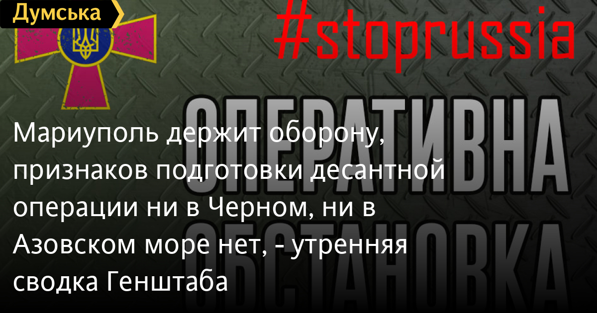 Мариуполь держит оборону, признаков подготовки десантной операции ни в Черном, ни в Азовском море нет, — утренняя сводка ГенштабаПо состоянию на начало двадцатых суток полномасштабного вторжения России положение и характер действий обороны без существенных изменений. Вооруженными силами Украины наносятся сокрушительные удары по группировкам войск и тыловой инфраструктуре оккупантов, сообщают в Генштабе Вооруженных сил Украины. За сутки группировкой Воздушных сил Вооруженных сил Украины были поражены четыре вертолета, один самолет, кроме того, наш истребитель сбил крылатую ракету врага. Группировки оккупационных войск, задействованных в ведении наступательной операции, значительных успехов на всех направлениях выдвижения не имели. Основные усилия сосредоточены на удержании занятых рубежей. Враг продолжает нанесение ракетно-бомбовых ударов по объектам критической инфраструктуры. Использует сеть учреждений здравоохранения на временно захваченных территориях Украины для лечения раненого личного состава. Также, захватчики по-прежнему коварно используют объекты гражданской инфраструктуры для оборудования огневых позиций, размещения вооружения и военной техники. По имеющейся информации, в связи проблем с обеспечением жизнедеятельности населенных пунктов на временно оккупированных территориях ОРДЛО, оккупанты вынуждены приостановить мобилизацию рабочих коммунальной сферы. Нравственно-психологическое состояние противника остается на низком уровне, что приводит к отказам военнослужащими ВС РФ выполнять приказы командования. Также, по имеющейся информации, жители, мобилизованные с временно оккупированных районов Луганской области направляются для пополнения потерь действующих частей российских оккупационных войск, привлеченных к боевым действиям на территории Украины. Противник пытается захватить Мариуполь. Украинскими воинами были успешно отражены атаки захватчиков. Общие потери врага составили около 150 человек, 2 танка, 7 БМП и один БТР. После понесенных потерь оккупанты прекратили наступательные действия и отступили. Артиллерия и авиация нанесли огневое поражение по скоплению военной техники и колоннам врага на маршрутах выдвижения. Были уничтожены 12 единиц автомобильной техники. Также потери понесли батальонные тактические группы из состава 336-й отдельной бригады морской пехоты и 11-й отдельной десантно-штурмовой бригады. В Черноморской и Азовской операционных зонах признаков подготовки к проведению морской десантной операции не обнаружено. СМЕРТЬ РОССИЙСКИМ ОККУПАНТАМ! Заметили ошибку? Выделяйте слова с ошибкой и нажимайте control-enter |