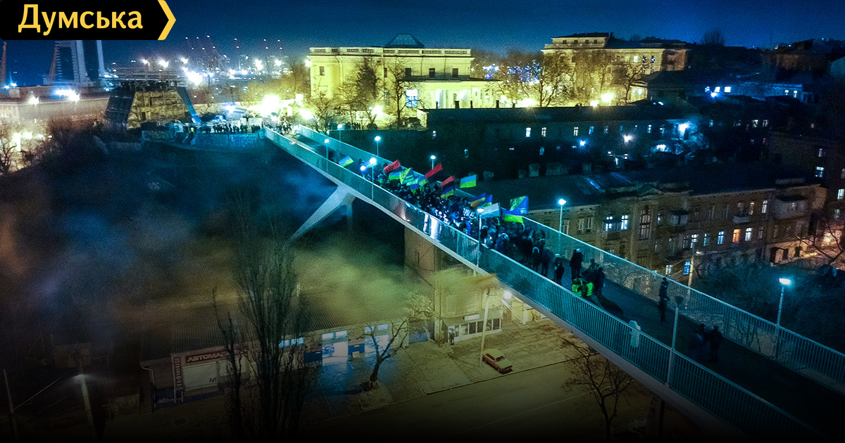 В финальной точке шествия — на Тещином мосту — активисты зажгли фаеры и исполнили государственный гимн Украины.