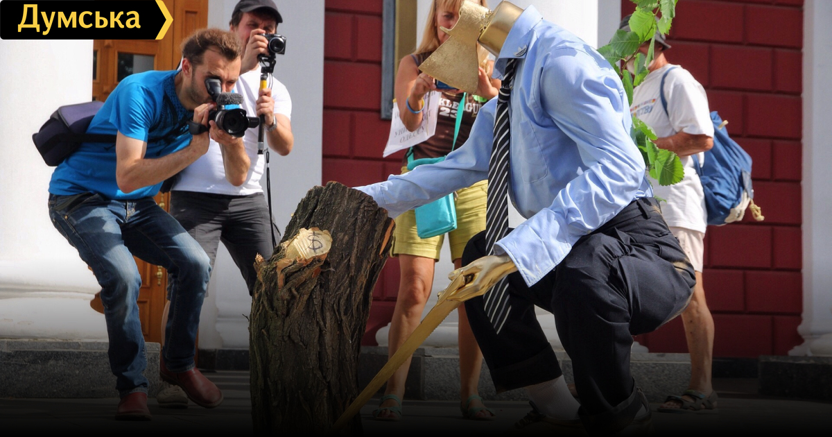 С приходом участников марша на Приморский бульвар активисты «антитрухановского майдана» открыли скульптурную композицию, посвященную зеленым насаждениям города. Под покрывалом в цветах флага города оказалась фигура человека с топором вместо головы и с пилой в руке, который на пеньке свежеспиленного дерева вырезал свое имя «Гена».