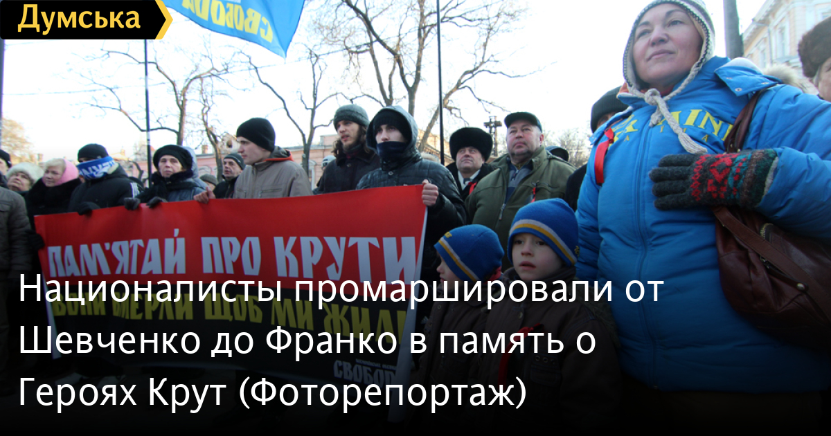 В акции приняли участие больше 50 человек. Молодые люди, некоторые из которых прятали свои лица под масками, размахивая флагами с символикой организаций «Свобода», «Сокол» и «Конгресс Украинских националистов» промаршировали от памятника Тарасу Шевченко в одноимённом парке до памятника Ивану Франко на пересечении Успенской и Александровского проспекта.
