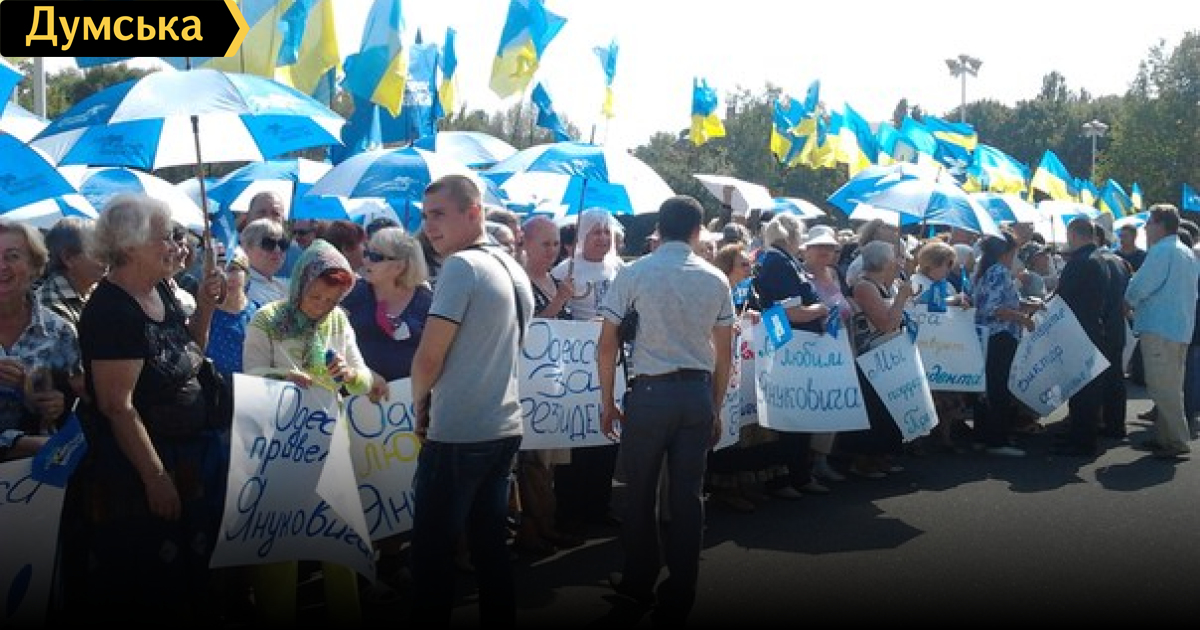 Всего на митинге присутствуют несколько сотен людей, среди которых — множество студентов одесских вузов, а также работников ЖКСов. К зданию ОГА они пришли с государственными флагами и знаменами Партии регионов. Планируется, что на площади перед администрацией Виктор Янукович будет вручать инвалидам автомобили. Своего часа здесь дожидаются шесть машин.
