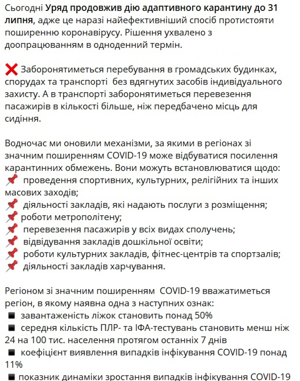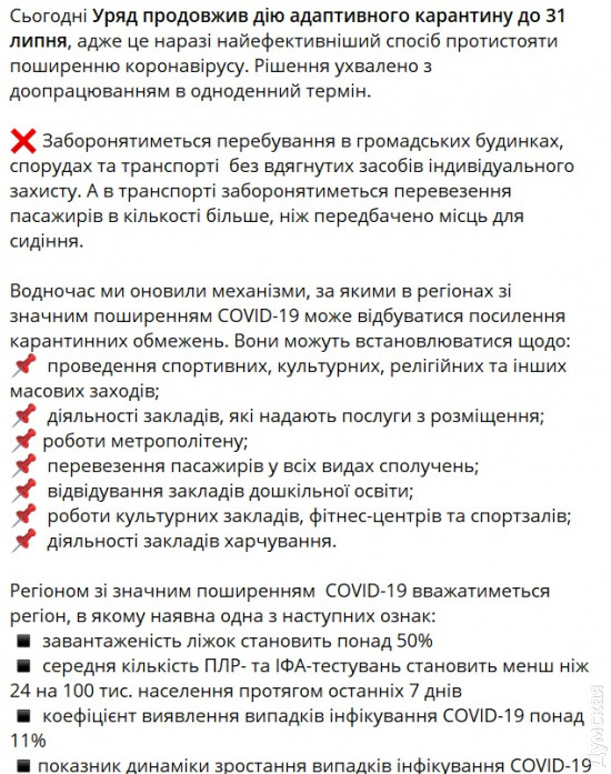 Кабинет министров продлил действие адаптивного карантина в Украине до 31 июля 2020 года. Об этом во время заседания правительства заявил премьер-министр Денис Шмыгаль. «Учитывая рост количества больных коронавирусом, мы продлим действие адаптивного карантина до 31 июля этого года. Кроме того, мы рассмотрим предложенные Минздравом обновленный подход к адаптивному карантину, который включает возможность усиления карантина в определенных регионах, если этого будет требовать ситуация», — отметил премьер. Он подчеркнул, что на протяжении последней недели количество заболевших коронавирусом в Украине постоянно увеличивается. «Ослабление карантинных мероприятий многие восприняли как отмену карантина. Однако угрозы от вируса не стали меньше»,- добавил он. Премьер уточнил, что под запретом останется пребывание в общественных зданиях, сооружениях и транспорте без надетых средств индивидуальной защиты, а в транспорте запрещена перевозка пассажиров в количестве больше, чем мест для сидения. При этом в регионах со значительным распространением COVID-19 может происходить усиление карантинных ограничений. Они могут касаться проведения спортивных, культурных, религиозных и иных массовых мероприятий, деятельности гостиниц и баз отдыха, работы метрополитена, перевозки пассажиров во всех видах сообщений, посещения учреждений дошкольного образования; работы культурных заведений, фитнес-центров и спортзалов, а также деятельности заведений общепита. Регионом со значительным распространением COVID-19 будет считаться тот, в котором имеется один из следующих признаков: загруженность коек составляет более 50%; среднее количество ПЦР - и ИФА-тестов составляет менее чем 24 на 100 тысяч населения; в течение последних 7 дней коэффициент выявления случаев инфицирования COVID-19 более 11% показатель динамики роста случаев инфицирования COVID-19 более 8 случаев на 100 тысяч населения. Решение об усилении или ослаблении ограничительных мер и в дальнейшем будут принимать региональные комиссии ТЭБ и ЧС на основе оценки эпидемической ситуации. СМЕРТЬ РОСІЙСЬКИМ ОКУПАНТАМ! Помітили помилку? Виділяйте слова з помилкою та натискайте control-enter |