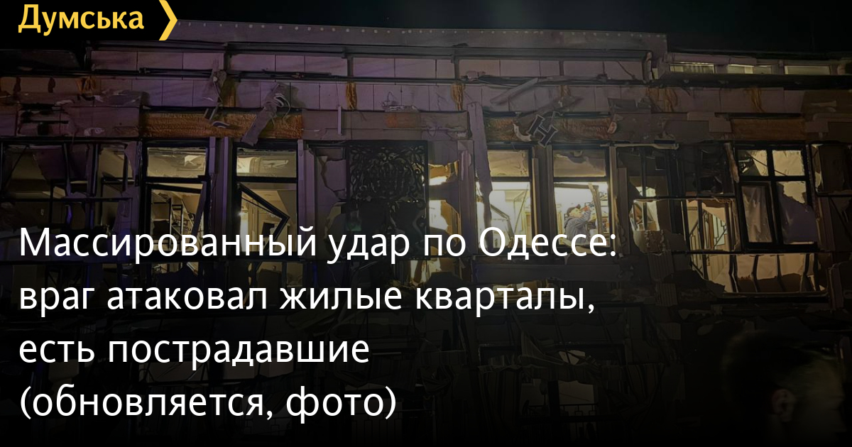 Массированный удар по Одессе: враг атаковал жилые кварталы, есть пострадавшие (обновляется, фото)Массированный удар дронами нанес враг ночью по жилым кварталам и объектам гражданской инфраструктуры Одессы. Как сообщили в военной администрации, за медицинской помощью обратились 10 человек, среди них двое детей. Наибольшие разрушения зафиксированы в Приморском районе. Повреждены жилые дома и гостиница в центре города. Также под ударом оказались Хаджибейский и Киевский районы. Там пострадали высотки, дома, частные дома и машины. ОБНОВЛЕНО В 8:25. Число пострадавших возросло до 11, среди них 2 детей, сообщили в областной военной администрации. Досталось и фуникулеру на Приморском бульваре Повреждения получила также припортовая территория. СМЕРТЬ РОССИЙСКИМ ОККУПАНТАМ! Заметили ошибку? Выделяйте слова с ошибкой и нажимайте control-enter |
