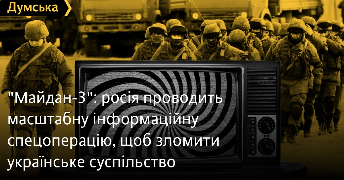 Росіяни проводять наймасштабнішу в своїй історії інформаційно-психологічну спецоперацію «Майдан-3» з метою роз'єднати українське суспільство, зламати волю українців до опору та водночас розвивати «втому від війни» серед західних політиків.