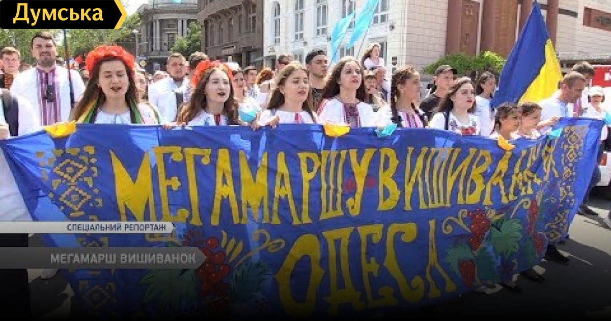 В Одессе прошел 12 мегамарш вышиванок.  Колона в национальной одежде прошлась через Дерибасовскую, Думскую площадь   и остановилась возле памятника Дюку де Ришелье