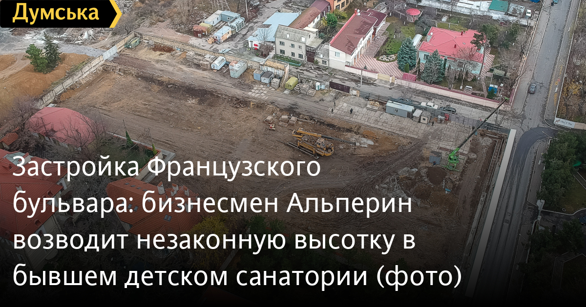По нашей информации, на этой земле, которую когда-то занимал детский санаторий имени Чувырина (у него было несколько территорий, в том числе с другой стороны бульвара, возле университета, а также на Фонтане и в Аркадии), появится семиэтажный жилой дом. За этим строительством, утверждают источники в мэрии, стоит известный бизнесмен Вадим Альперин, недавно задержанный по подозрению в даче взятки детективам НАБУ.